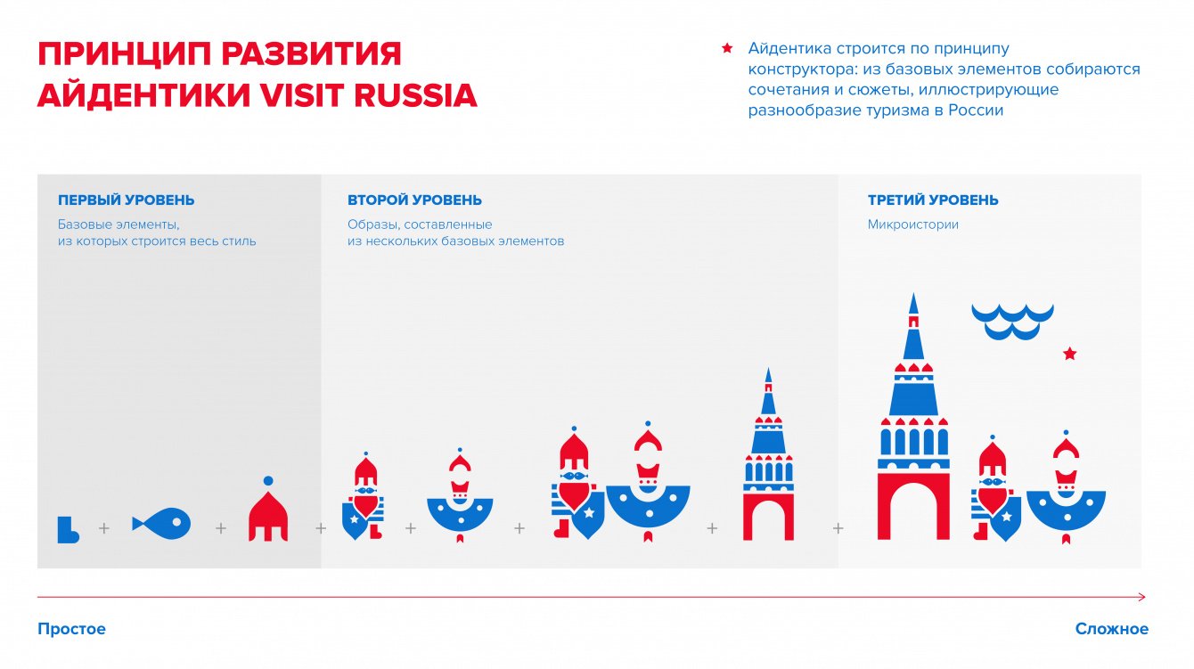Система айдентики туристических офисов Visit Russia базируется на обширном ряде элементов. Это узнаваемые общеизвестные символы России, поданные в легком современном ключе, с живым и ироничным обыгрыванием многих устойчивых представлений о российских реалиях. Из отдельных простых элементов могут складываться образы и сюжеты, которыми маркируются разновидности туризма в России.