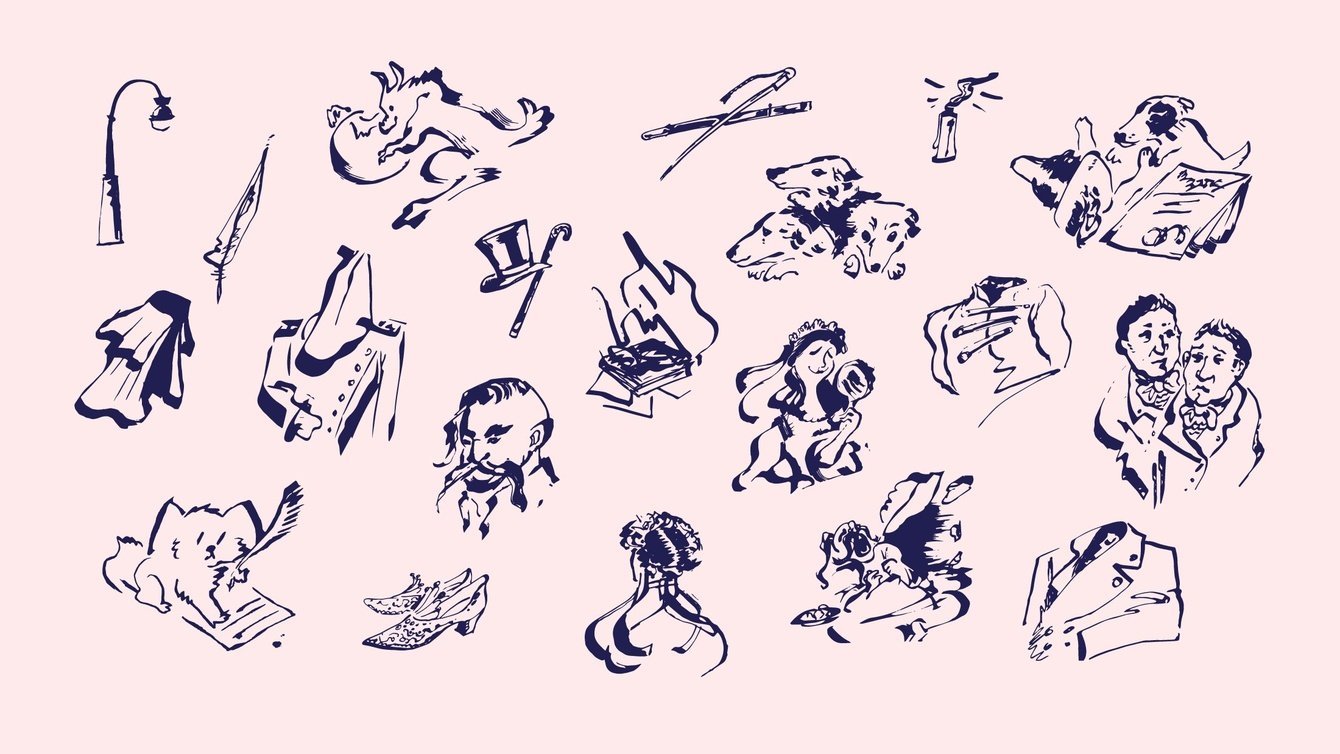 Для оформления жилого комплекса была разработана серия чернильных иллюстраций, основанных на графике черновых рисунков поэтов XIХ века и в частности, самого Гоголя. Они могут быть вписаны прямо в строки текста, имитировать книжную иллюстрацию, концовку, заставку или выполнять фоновую украшающую роль.