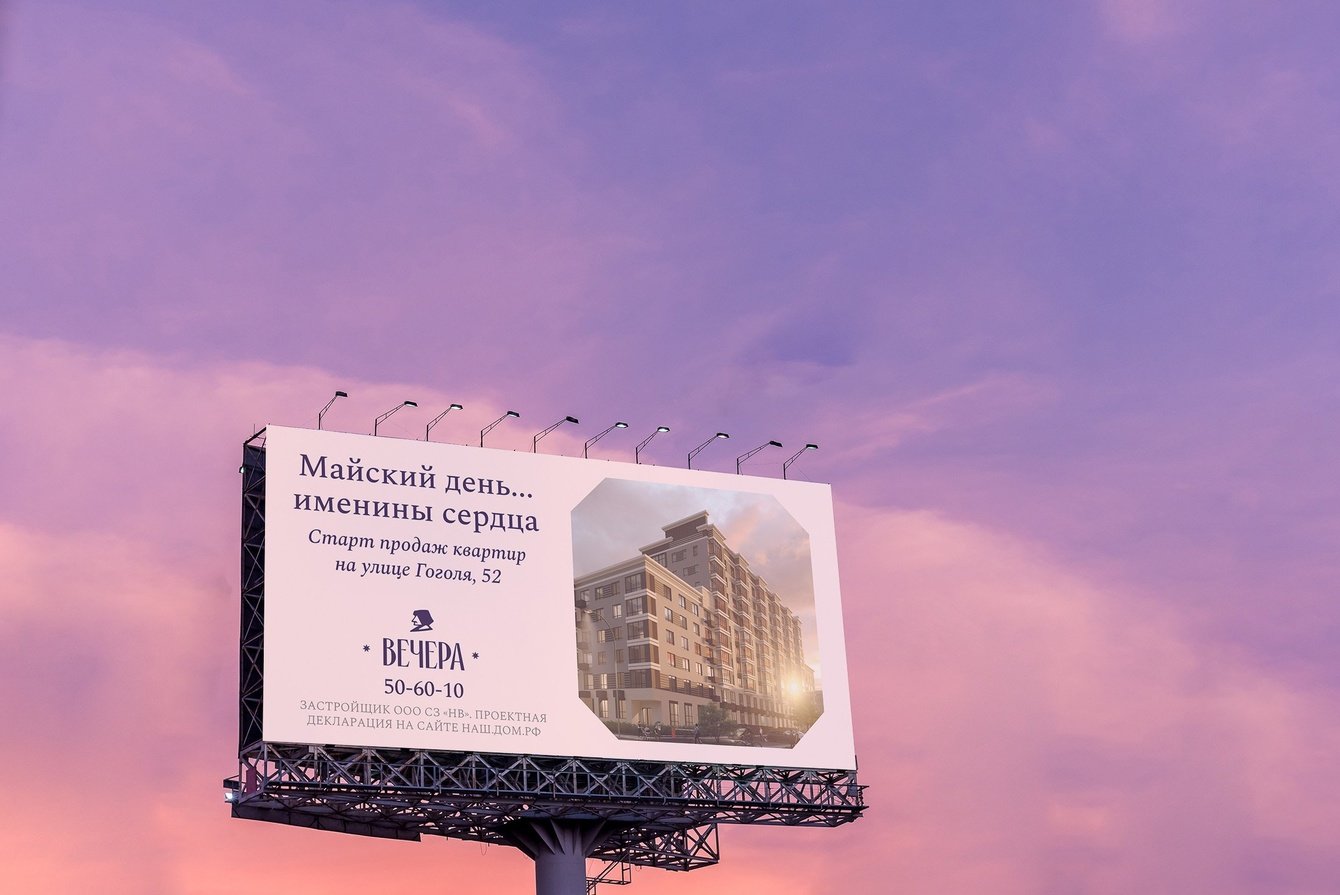 Коммуникация жилого комплекса представляет собой игру слов, книжные отсылки, а визуальные приемы объединяют всё воедино и создают ощущение вечера в состоянии уюта и благополучия. Рекламные слоганы мы разработали в соответствии с брендовой тональностью – это художественный, утонченный язык, отражающий высокий уровень культурного и социального статуса жильцов. Например, к старту продаж использовали буквальное цитирование, подошедшее прямо впору.