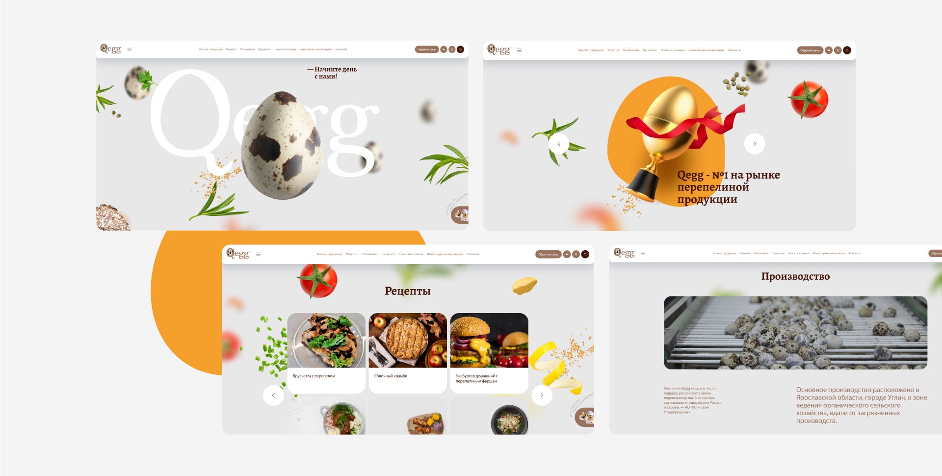Яйцо — ключевой символ — плавно трансформируется в динамичные формы, задающие ритм всему сайту. Тёплые желтые элементы становятся: фонами блоков с рецептами, основой для иллюстраций, связующим звеном между разделами.