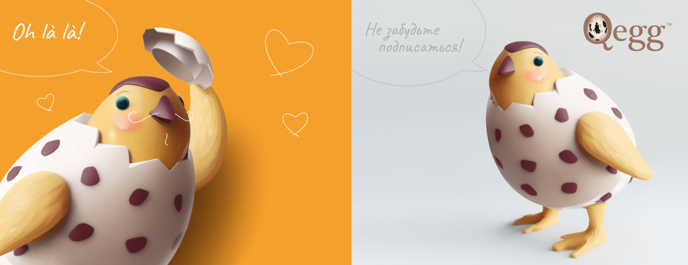 Еще на этапе разработке SMM-стратегии было предложено разработать маскота — персонажа бренда. Он приобрел образ обаятельного птенца перепелки в яичной скорлупе, который помог бренду создать более эмоциональную связь с аудиторией, за счет индивидуальности и легкого французского настроения.
