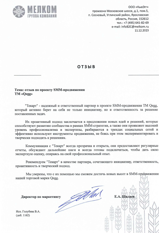 "Текарт" - надежный и ответственный партнер в проекте SMM-продвижения ТМ Qegg, который активно берет на себя не только инициативу, но и ответственность за решение поставленных задач.