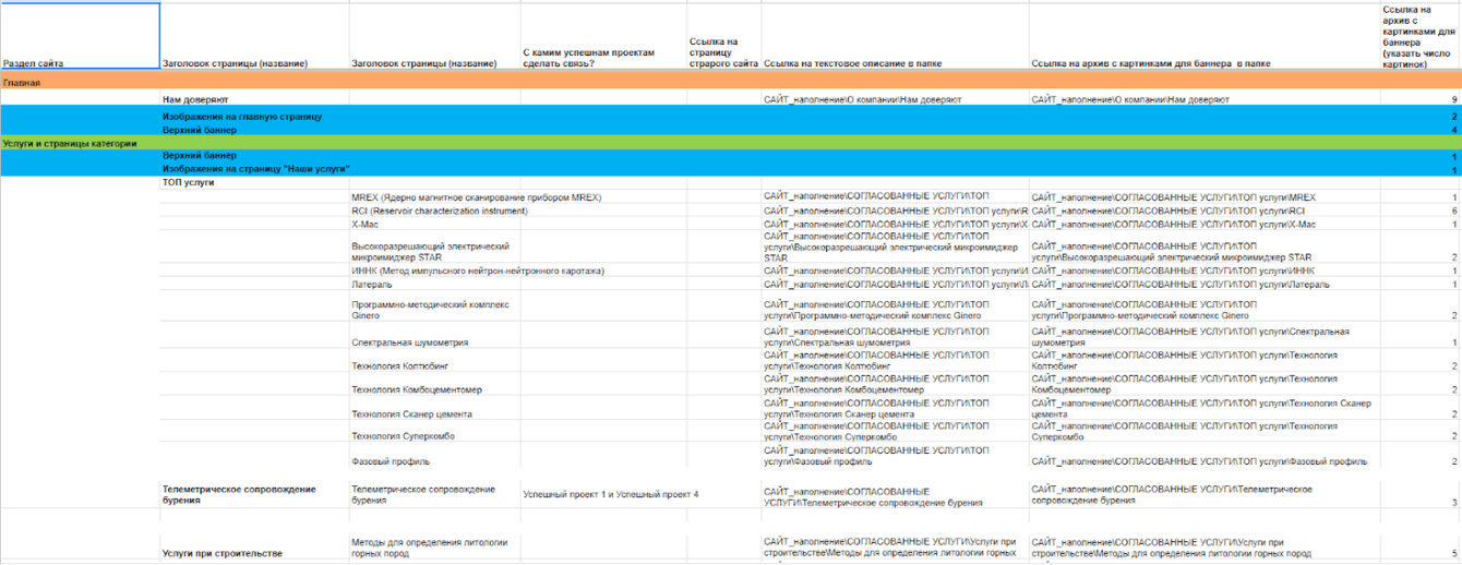 Этап наполнения сайта оказался сложным. Клиент присылал контент малыми частями, и чтобы упорядочить информацию, мы создали таблицу со структурой сайта. Клиент подготовил все материалы, включая подписи к картинкам, что позволило нам успешно наполнить около 150 страниц сайта.