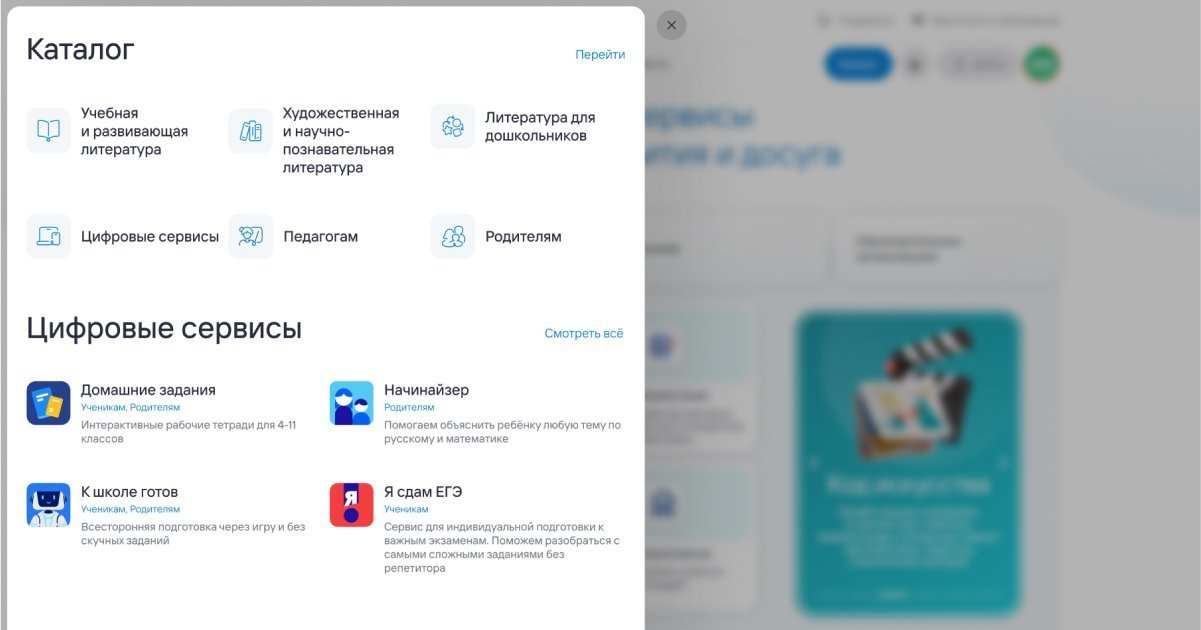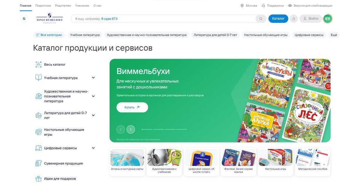 Из внешнего контура пользователь может легко попасть в e-commerce часть сайта (внутренний контур) — единый каталог с печатной продукцией, электронными учебниками, цифровыми сервисами и бесплатными материалами.