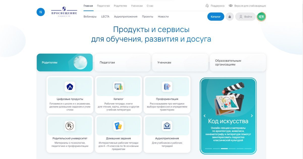Пользовательский сайт состоит из двух частей — контуров — объединяющих взаимодействие всех клиентов «Просвещения» на один мультисервис.