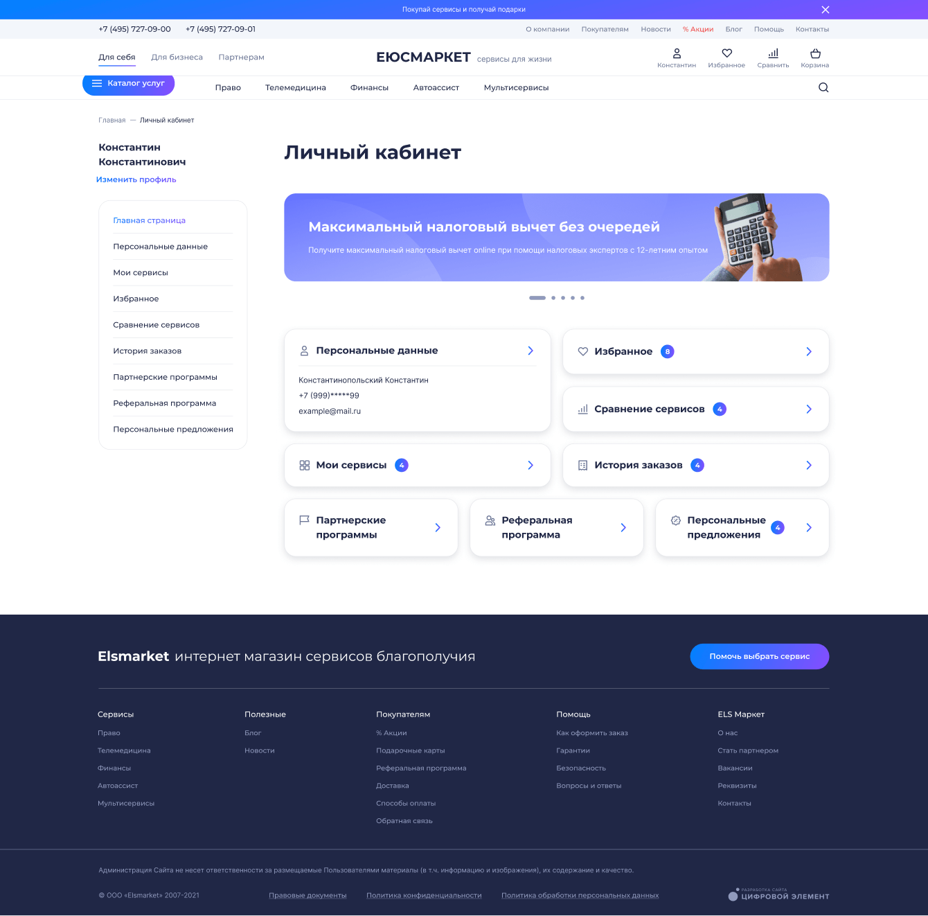 Пользователю доступна фильтрация сервисов по определенным характеристикам на странице каталога и направления, возможность добавить сервис в корзину, в избранное, к сравнению, далее оплатить сервисы и управлять подпиской на них в личном кабинете.