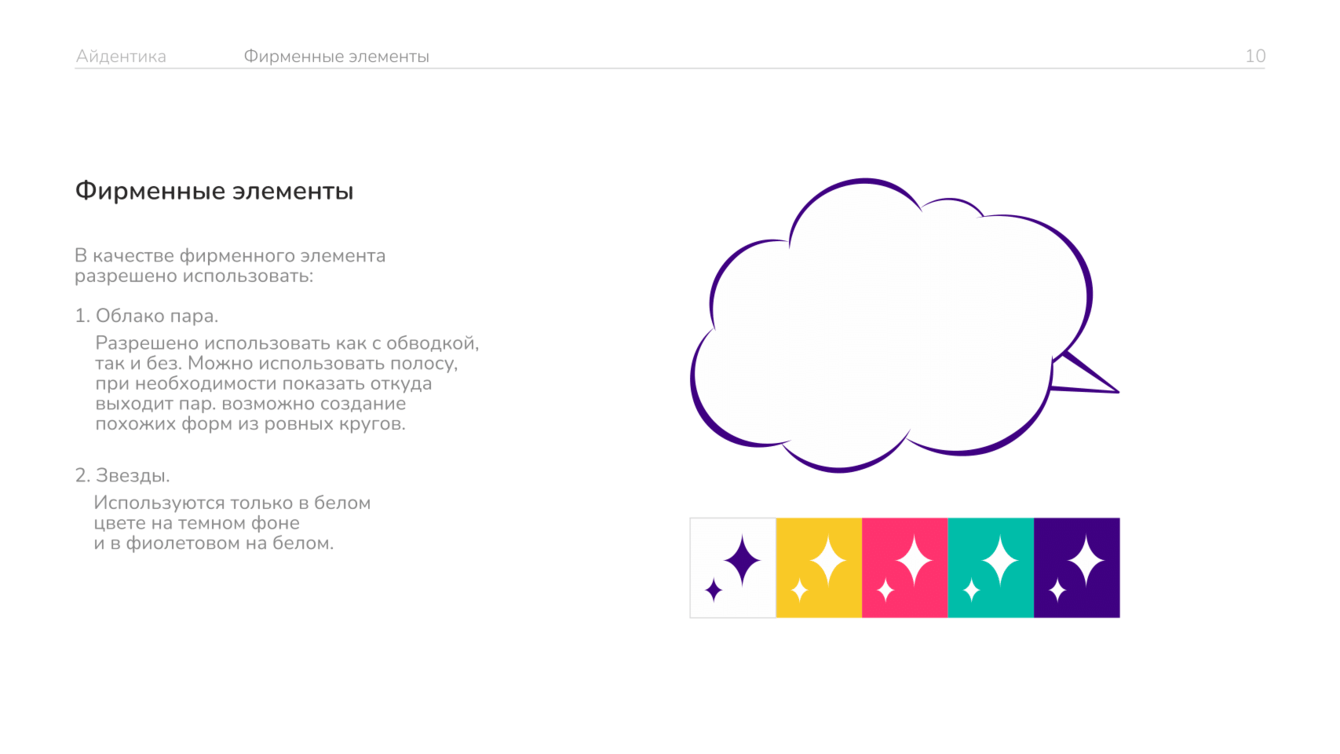 Добавили графические элементы, которые обогащают визуальную айдентику бренда. Облако пара — используется с обводкой и без, помогает создавать эффект динамики. Звезды — применяются только в белом цвете на темном фоне или в фиолетовом на светлом.