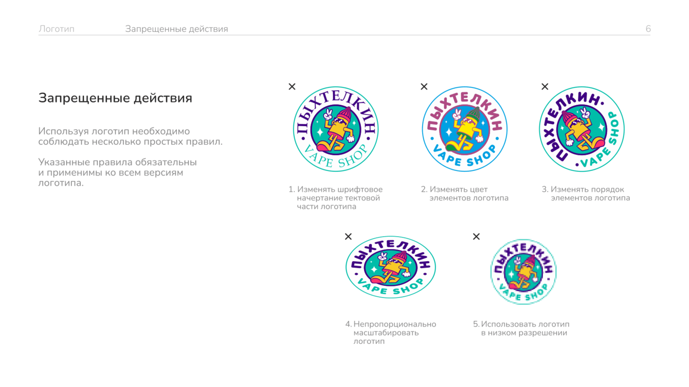 В руководстве по использованию фирстиля подробно расписали, как нельзя изменять логотип: менять шрифт, элементы, порядок элементов логотипа, непропорциональное масштабирование и использование в низком разрешении.