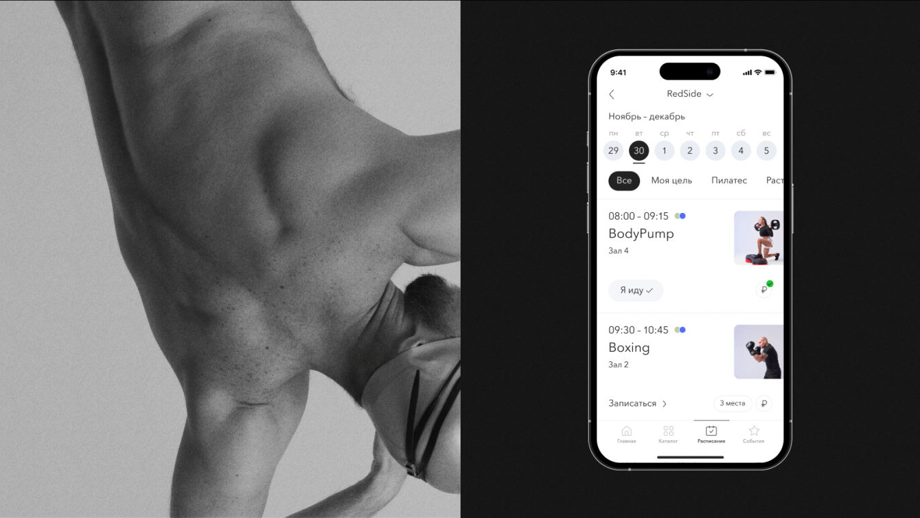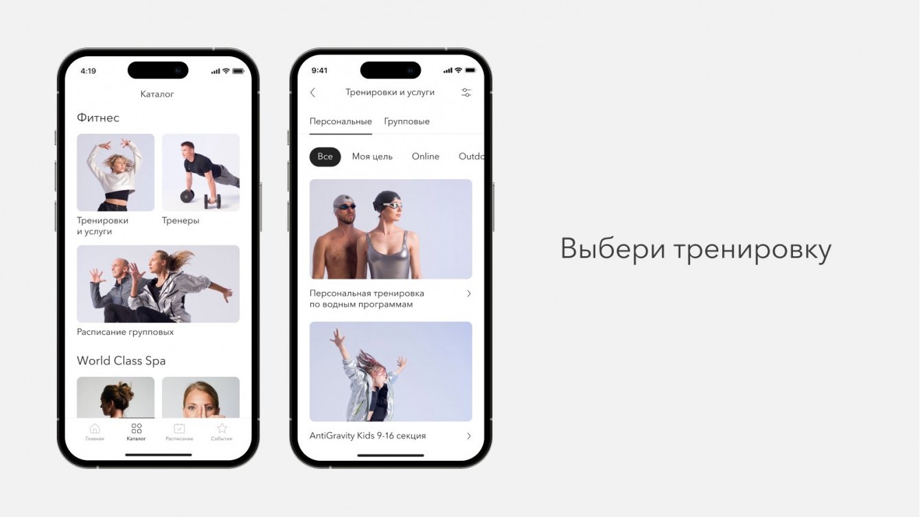 Дизайн приложения минималистичный и довольно строгий, с узнаваемыми деталями бренда и духа World Class. В дизайне мы используем много изображений, отснятых с тренерами в клубах и на тренировках. Они задают правильное настроение, мотивируют и вовлекают в тренировочный процесс, это важная составляющая бренда и лица World Class. Мы выносим на первый план больше коммуникации, за счёт чего укрепляем связь клуба и пользователя и делаем их опыт более персонализированным.