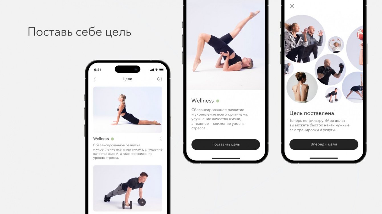 Выбрав цель (только одну!), пользователь сразу получает набор рекомендаций по услугам и тренировкам (так называемый стартовый пакет) — и тут же может записаться на пробное занятие. Сбрасываешь вес? Попробуй тренировку в тренажёрном зале или бассейне. Хочешь укрепить здоровье? К твоим услугам спа, массаж и т. д.