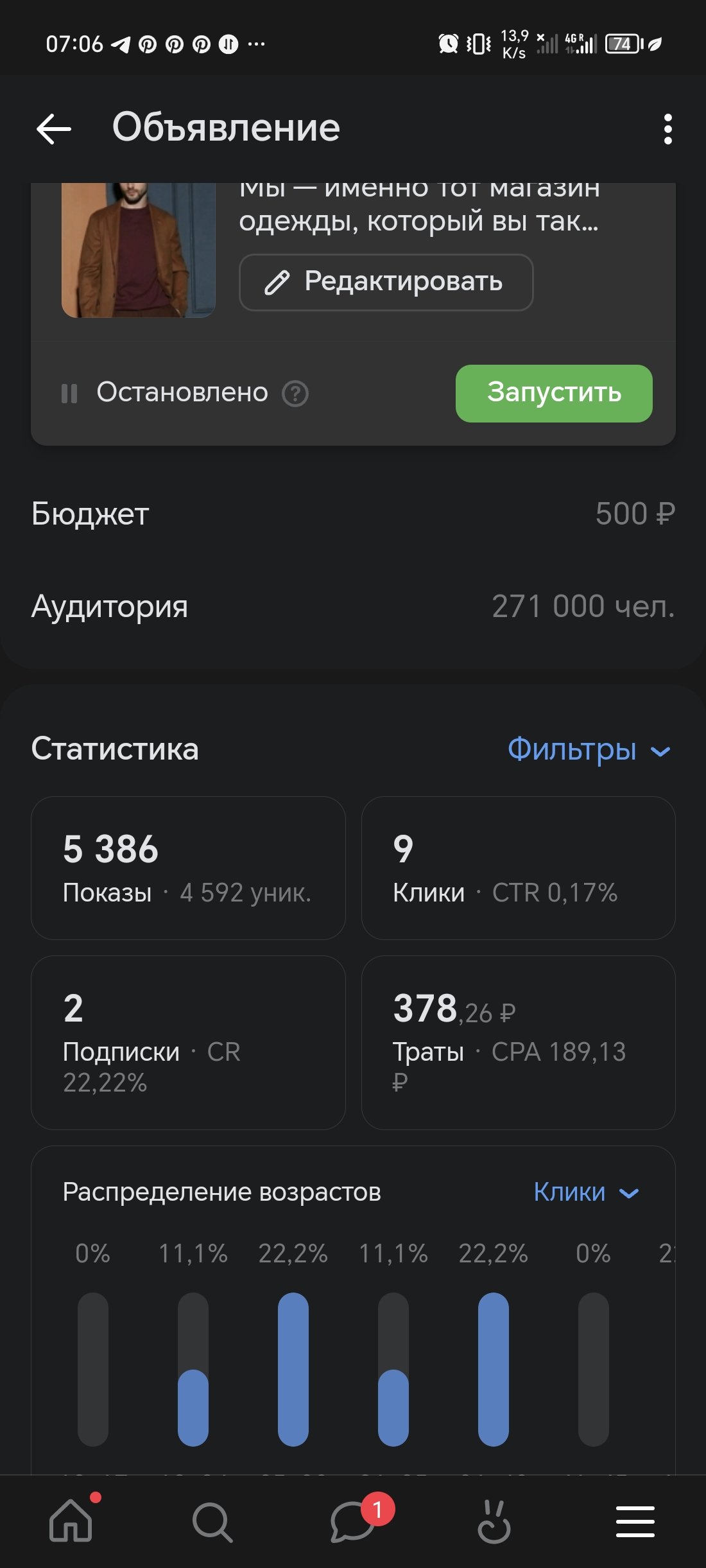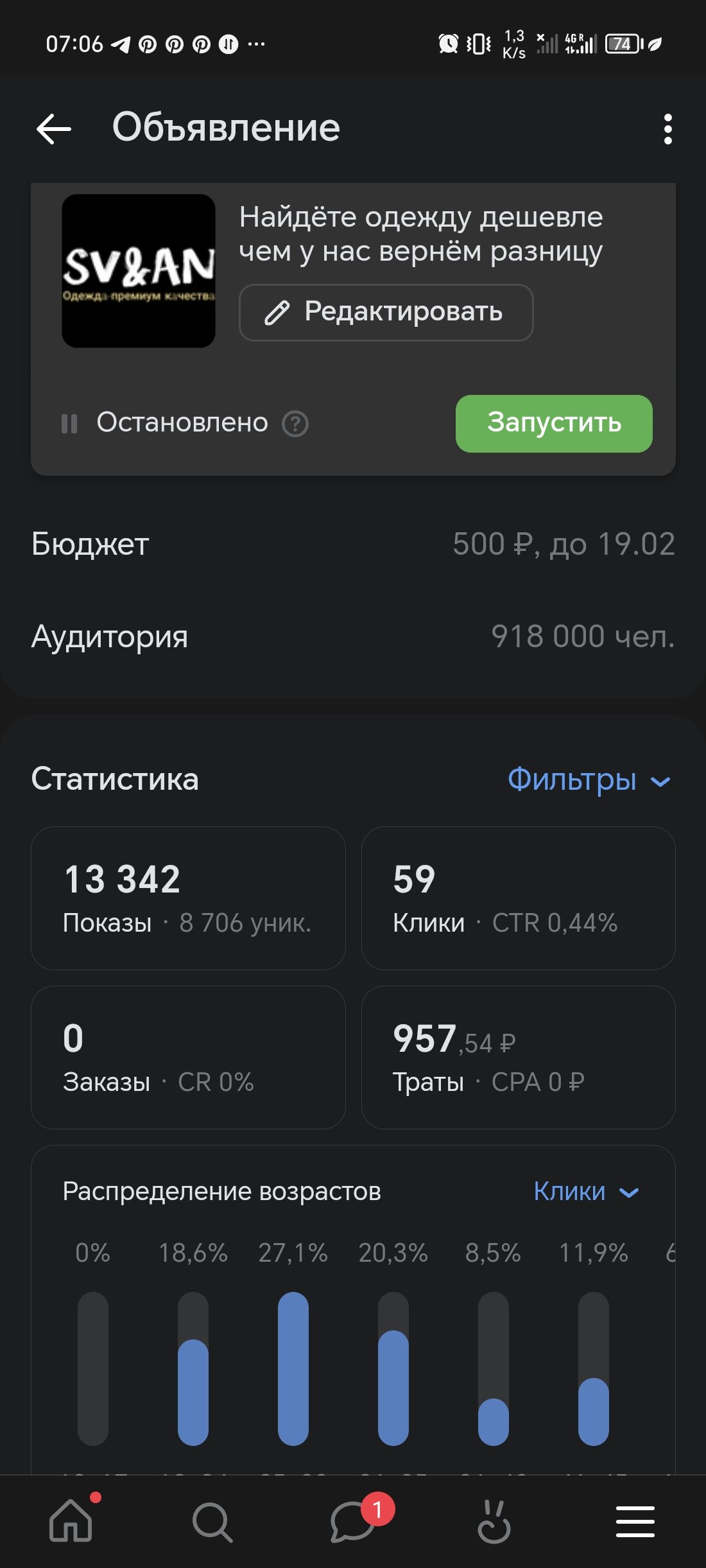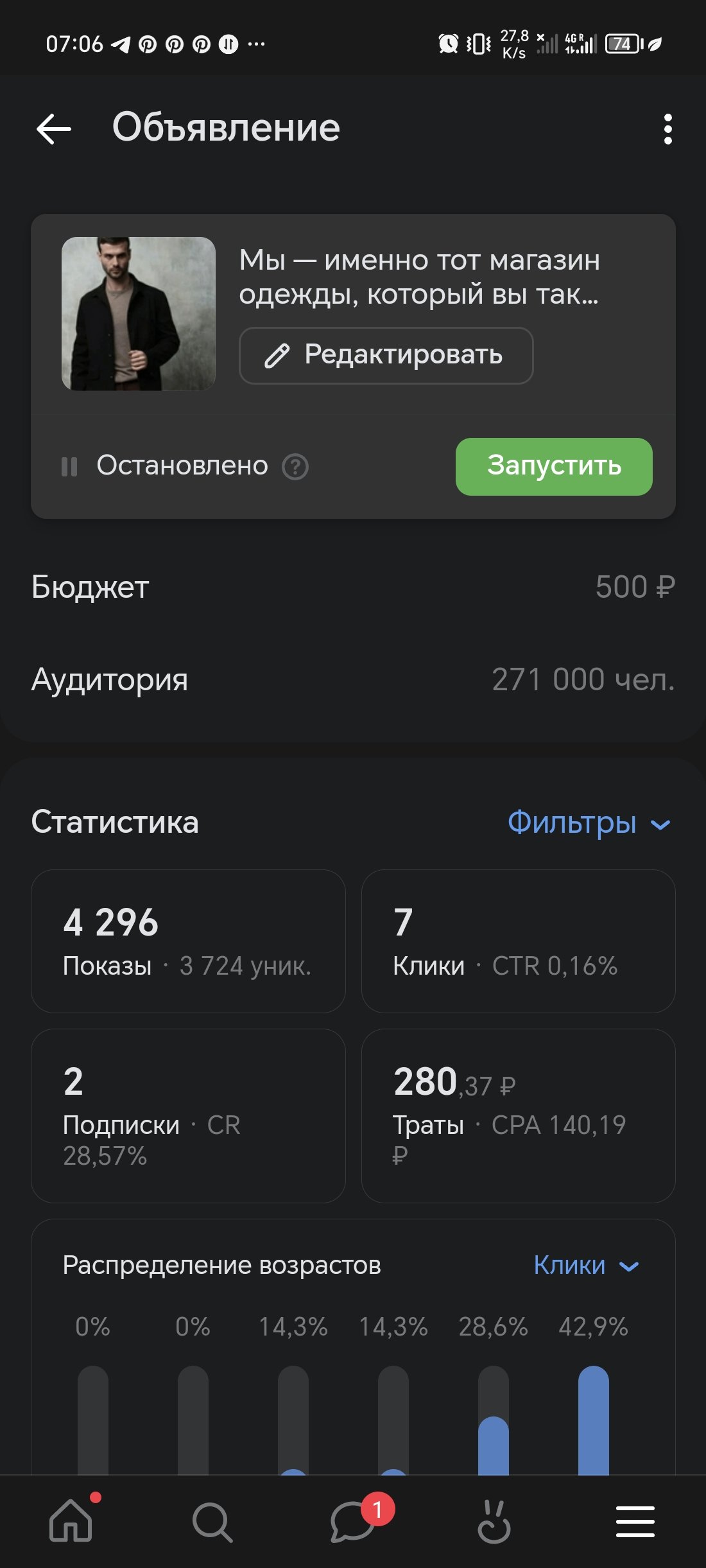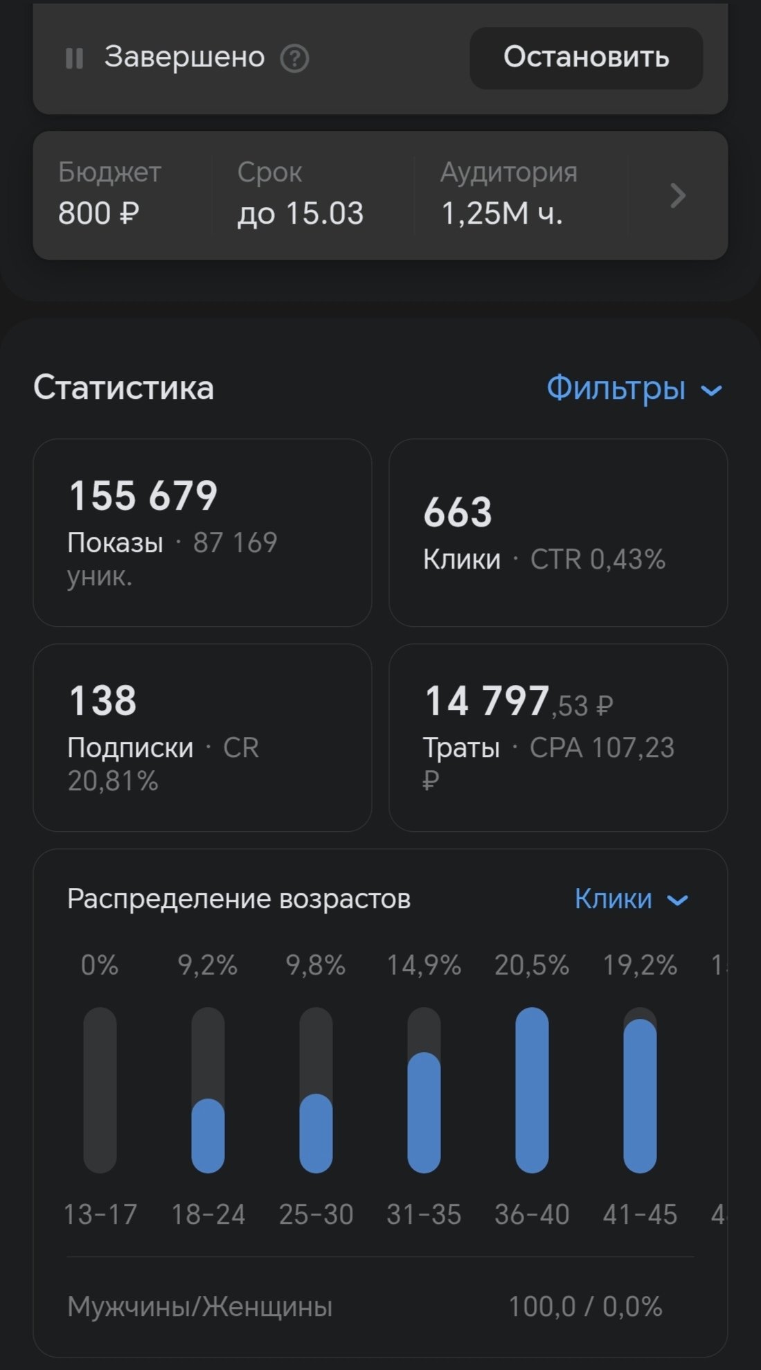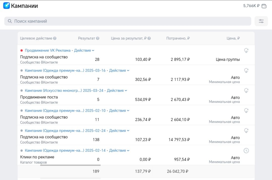 В итоге клиент остался доволен результатом таргетированной рекламы, да продажи были не очень большие( с учетом что половина бюджета была потрачена на тестовые запуски таргетированной рекламы), но акцент делался не на них а на наборе качественной аудитории. На скриншотах я показал, как проводились тестовые запуски таргета и самую успешную компанию.