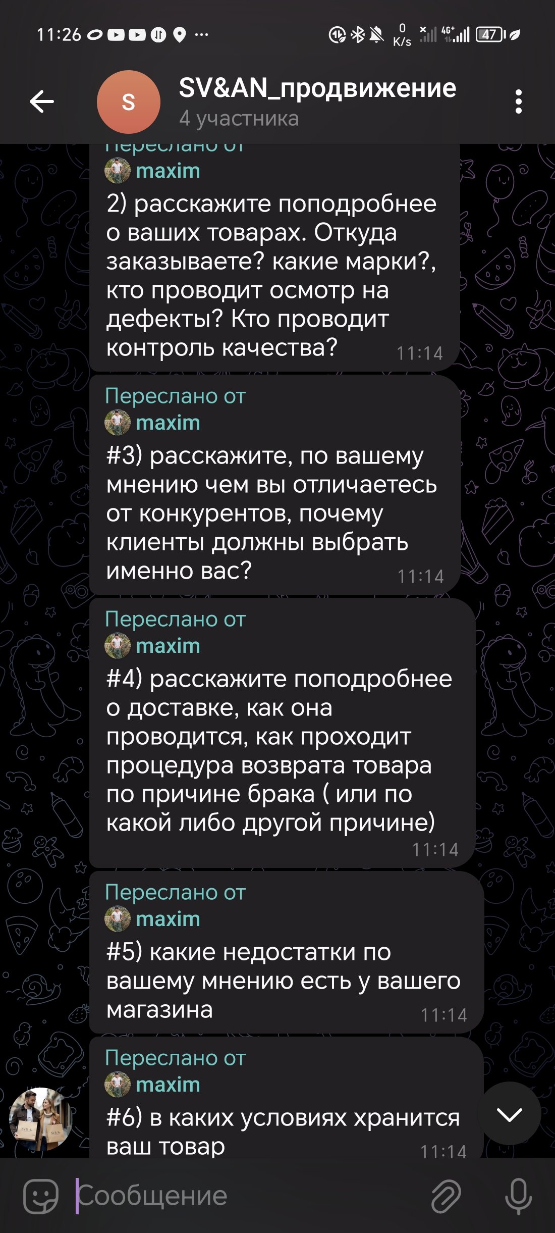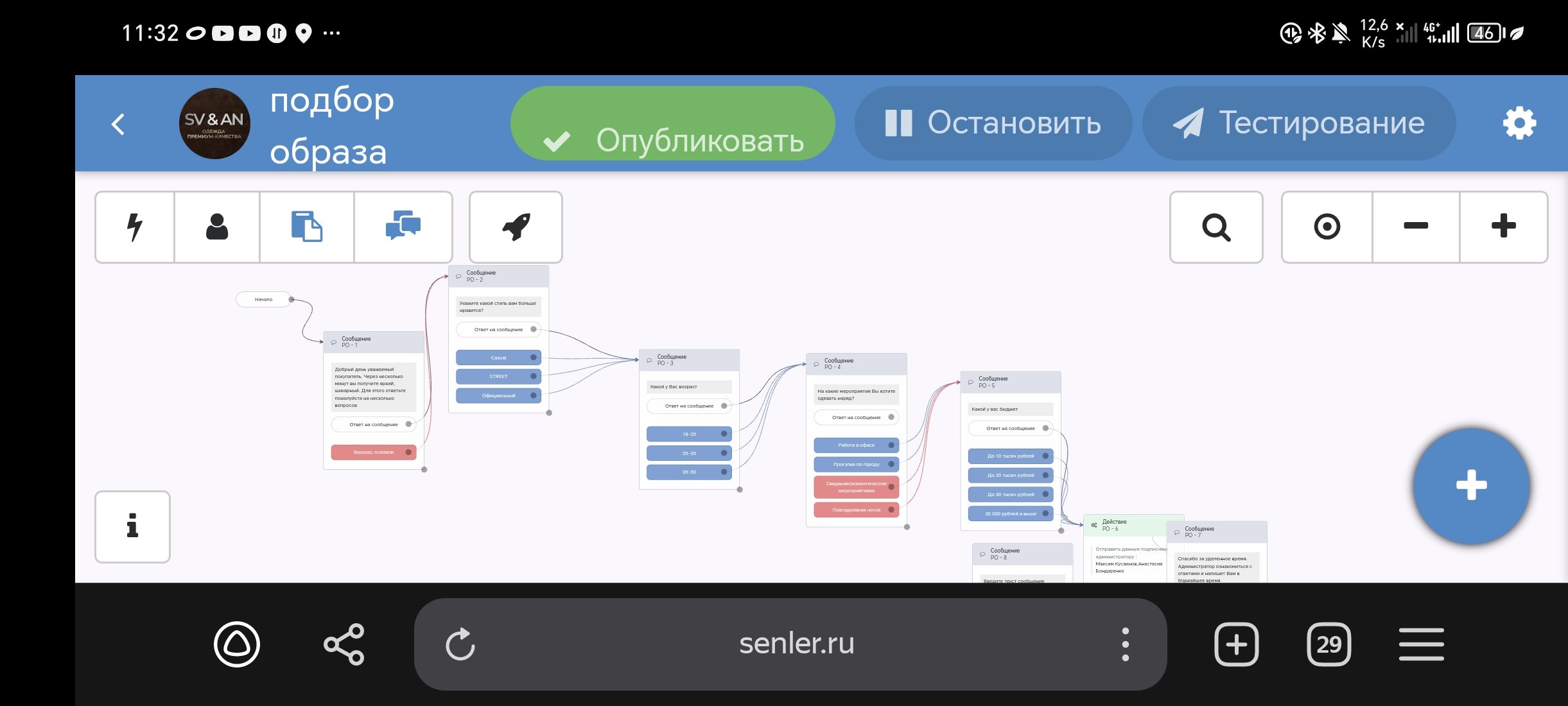 Так как во Вконтакте аудитория особо не читает посты в группах было принято решение, "прогревать" их через рассылки. Для этого я создал чат бота, грамотно и тщательно продумал систему рассылок и решил гнать аудиторию на него. Но к сожалению после запуска бота и первых результатов, хозяин магазина сказал, что у него закончился товар и он не может пока что предоставить выбор одежды и вся деятельность бессмысленна. Пришлось приостановить работу бота.