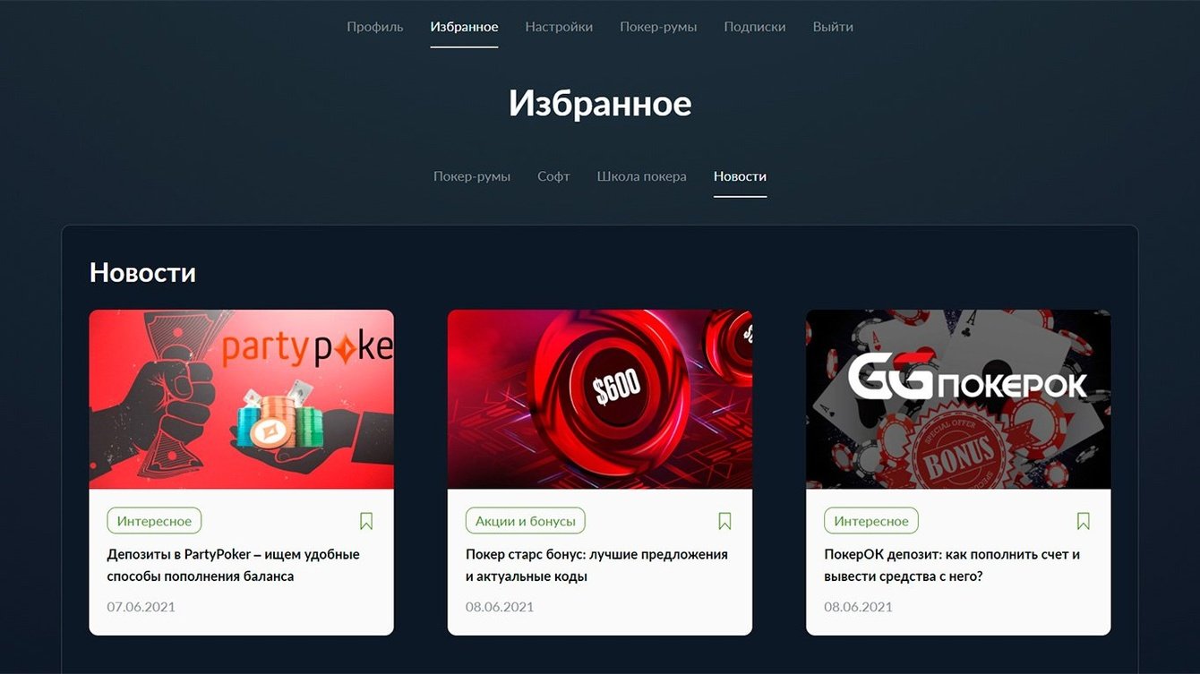 Отображение отзывов, добавление избранной информации, оформление подписки на рассылку, изменение настроек в ЛК, добавление покер-рума.
