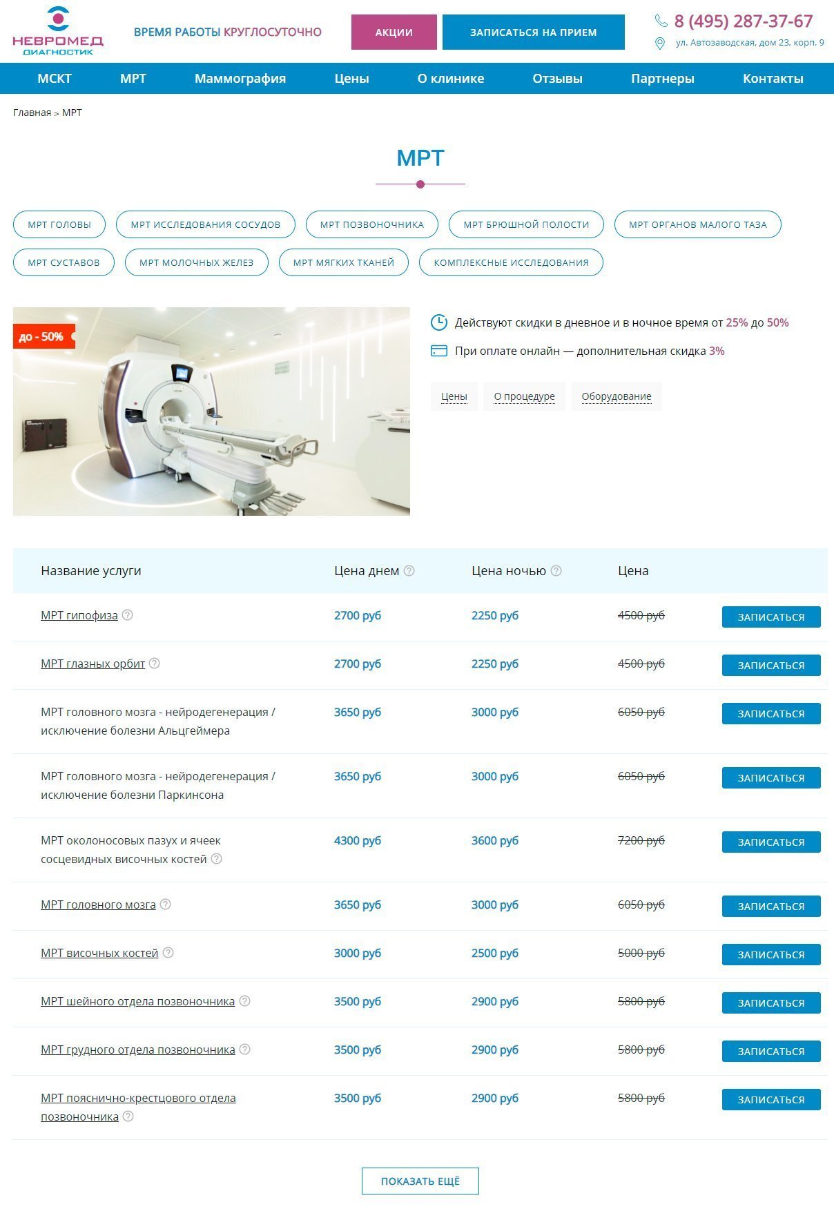 «Невромед-диагностик» специализируется на МРТ-диагностике, МСКТ-исследованиях, а также маммографии. Лечебно-диагностический центр работает без перерывов и выходных круглосуточно. В клинике работают квалифицированные известные в Москве специалисты по управлению томографом и анализу данных МРТ.