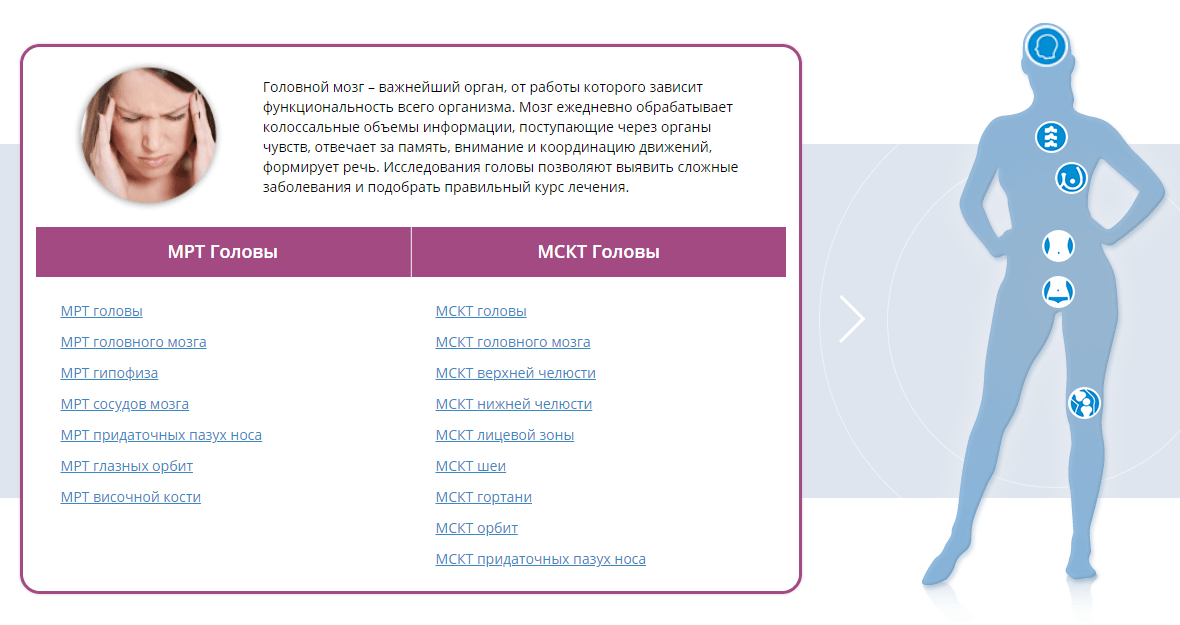 Разработали интерактивную схему с иконками на теле человека. При клике на иконку слева отображается информация с соответствующими разделами каталога услуг в разрезе по МРТ и МСКТ. Данный функционал дополнительно задерживает пользователей на сайте, также служит хорошим элементом для узнаваемости сайта.