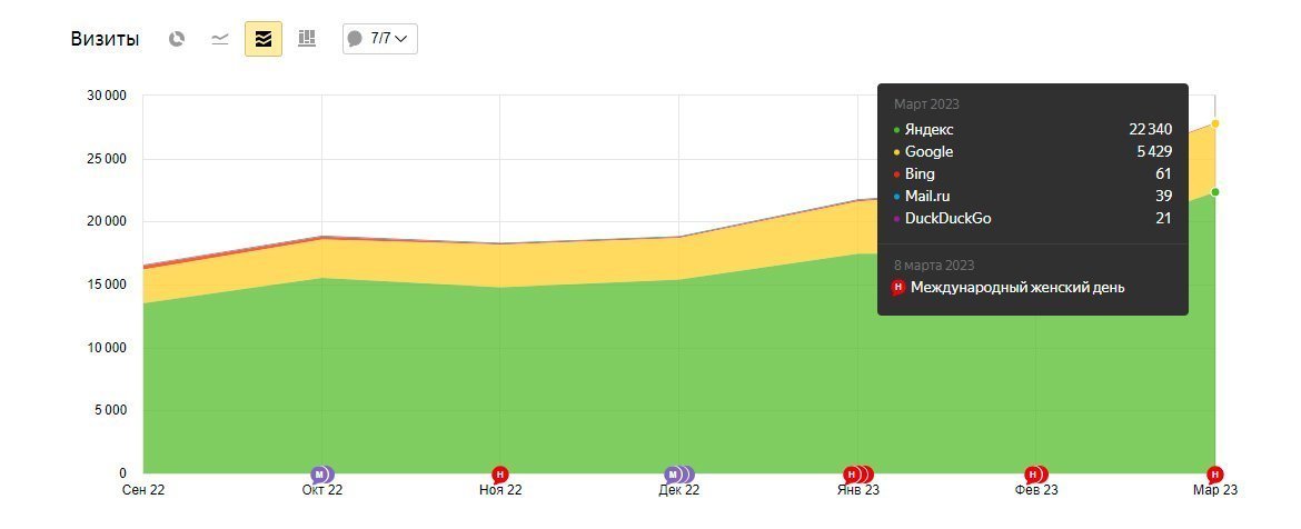 За 7 месяцев работы посещаемость из поисковых систем выросла на 67% с 16665 до 27931 визитов в месяц. Ниже представлен скриншот из сервиса статистики Яндекс.Метрика за период с сентября 2022 по март 2023 года.