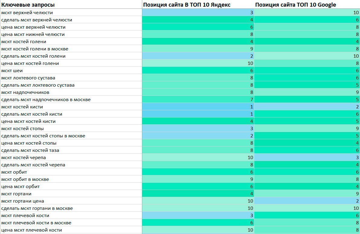 Заняли места в ТОП 10 поисковых систем Яндекс и Google по среднечастотным и высокочастотным запросам. В связи с короновирусом трафик на услугу МСКТ грудной клетки резко возрос!