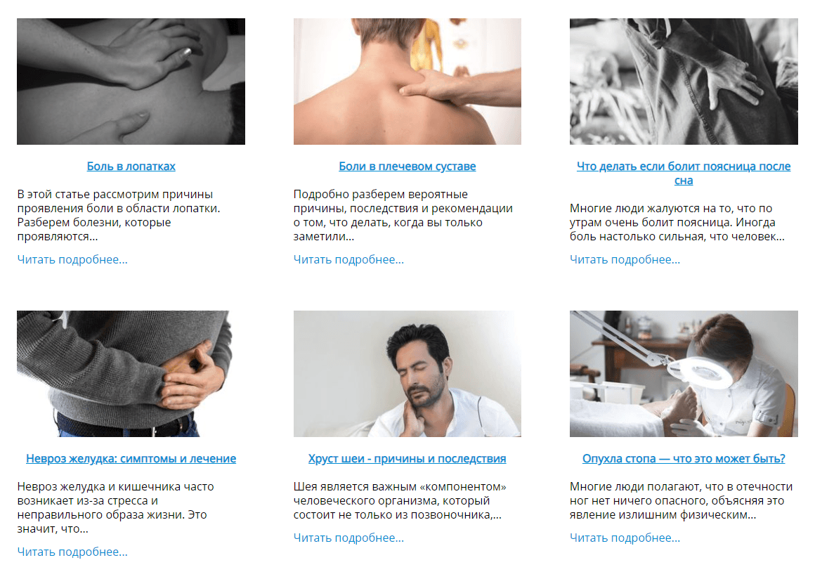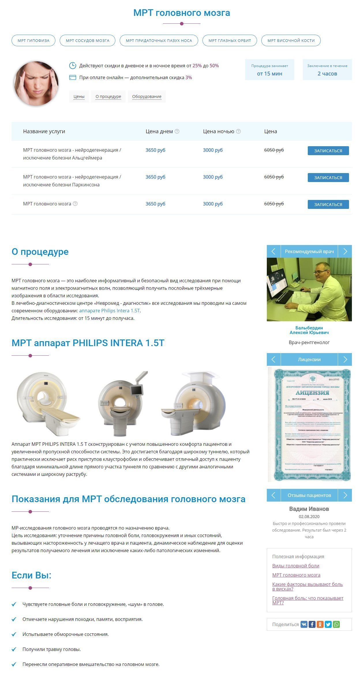 На страницах подразделов располагаются информативные тексты, с разделением на подзаголовки, полезные пользователю и оптимизированные для поисковых систем. Справа от статьи прикреплены релевантные отзывы, врачи по каждой услуге. Есть возможность поделиться материалом в социальных сетях. Всего создано около 120 посадочных страниц с размещенными текстами.