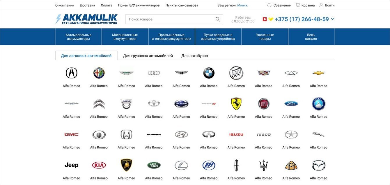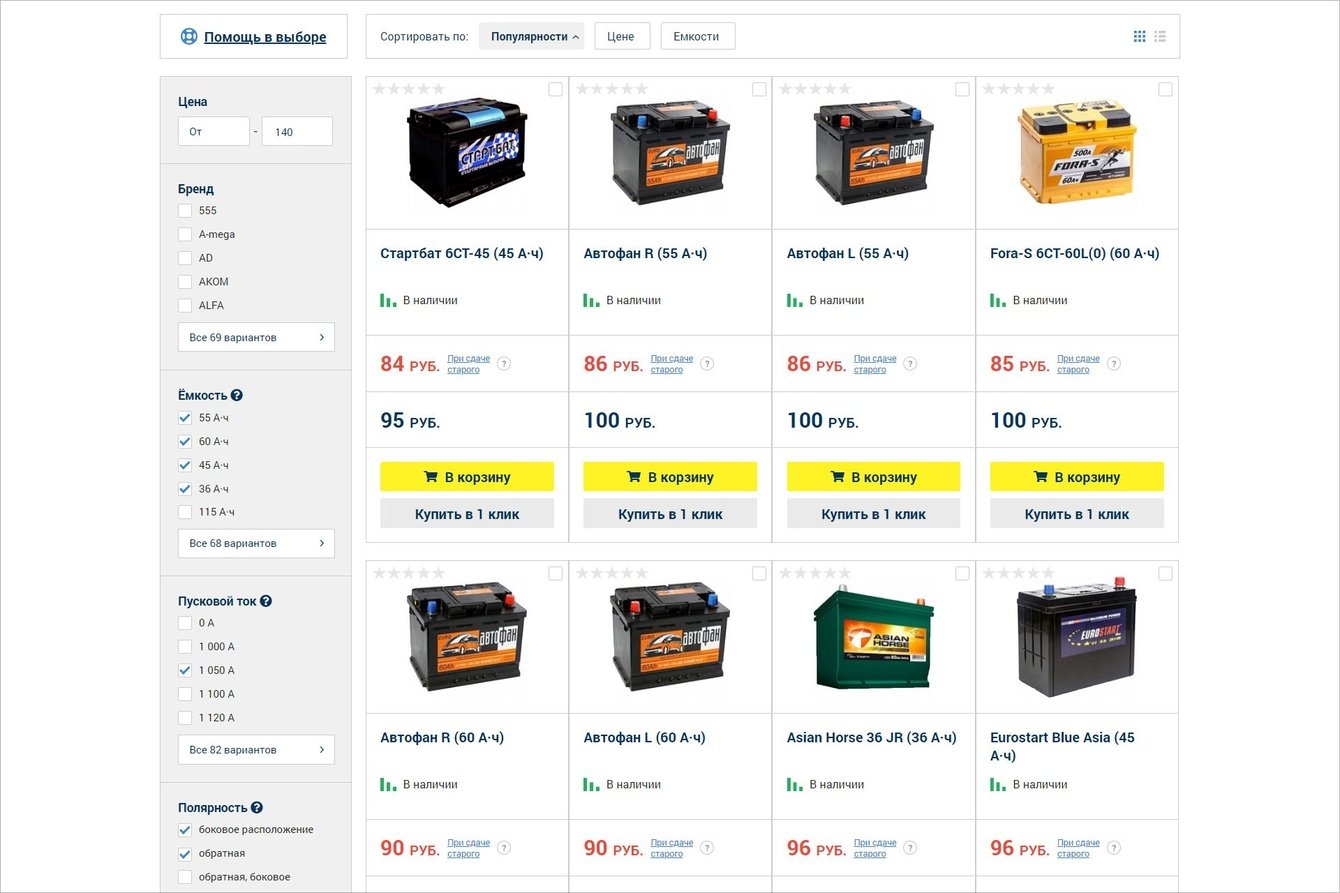 С разбивкой по марке, году выпуска, поколению и объему двигателя, для подбора аккумулятора по авто. Разработан специальный парсер и загрузчик, создана структура каталога для работы с низкочастотными запросами.