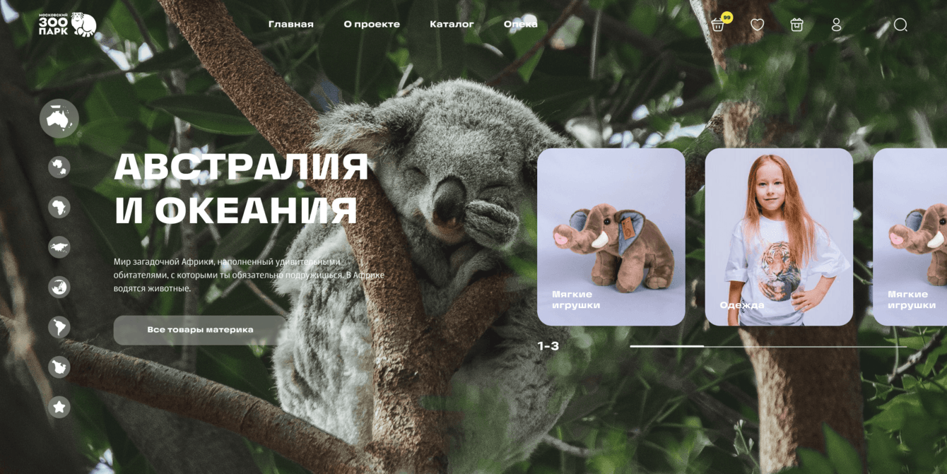 На самых первых брейнстормах с командой Заказчика родилась идея сделать обычный магазин образовательным проектом для всей семьи. Было предложено привязать животных, изображенных на товарах магазина, к материкам, на которых они обитают. Эта концепция легла в основу навигации главной страницы.