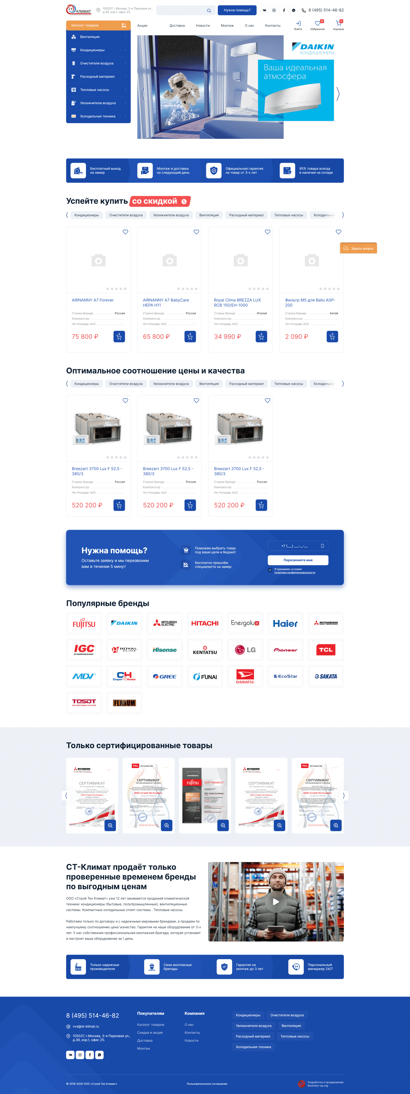 Позаботились о максимально удобном юзабилити и фильтрах, которые помогут пользователям выбирать технику в несколько кликов. Создали структуру и тематическое оформление, удобные для восприятия. Мы сделали упор на удобную структуру и реализацию фильтров для быстрого выбора климатического оборудования, функциональный личный кабинет и детализованные карточки товара. Внедрили конверсионные элементы, оформление – полностью соответствует фирменной атрибутике компании заказчика. Проектирование заняло 1 неделю.
