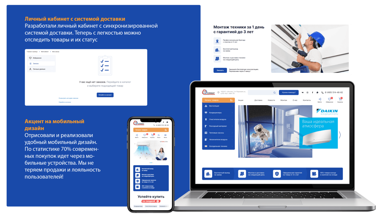 Позаботились о максимально удобном юзабилити и фильтрах, которые помогут пользователям выбирать технику в несколько кликов. Создали структуру и тематическое оформление, удобные для восприятия. Мы сделали упор на удобную структуру и реализацию фильтров для быстрого выбора климатического оборудования, функциональный личный кабинет и детализованные карточки товара. Внедрили конверсионные элементы, оформление – полностью соответствует фирменной атрибутике компании заказчика. Проектирование заняло 1 неделю.