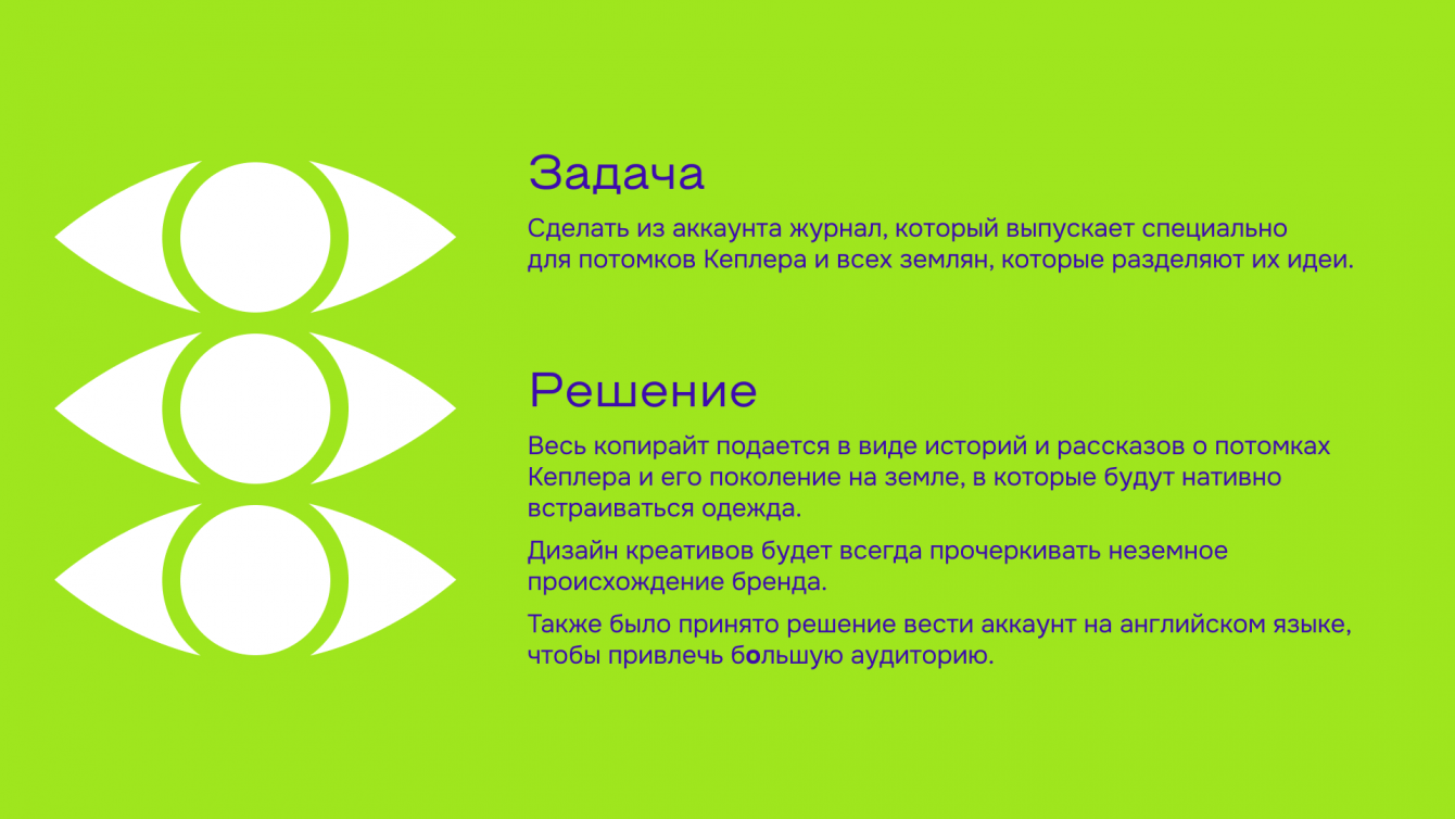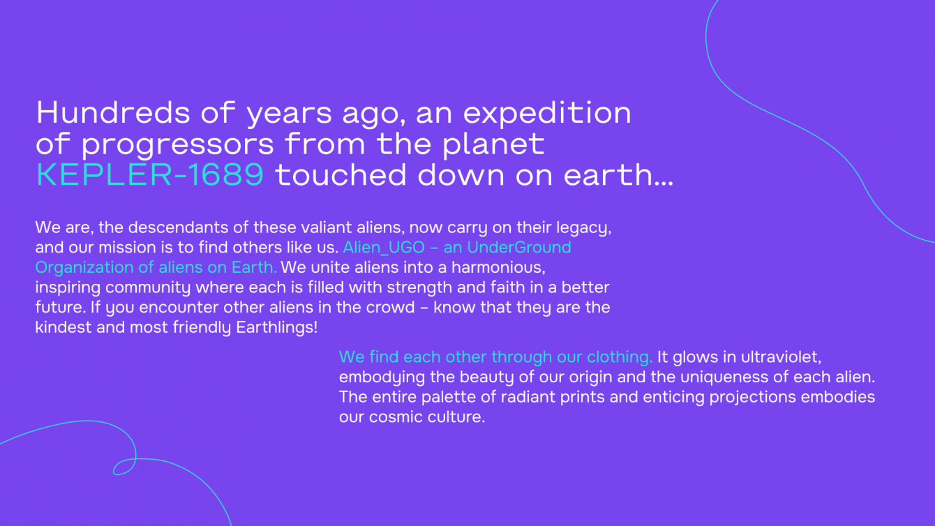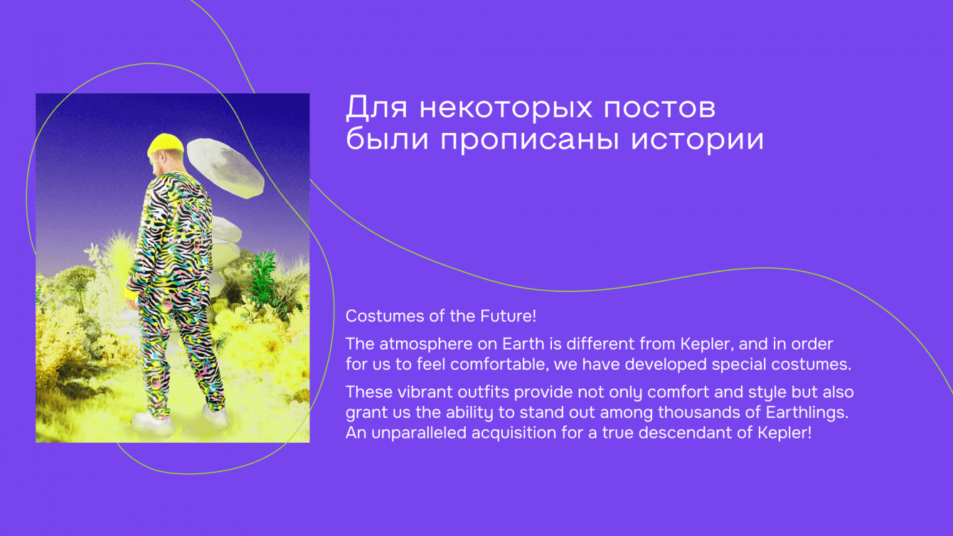 Весь копирайт подается в виде историй и рассказов о потомках Кеплера и его поколение на земле, в которые будут нативно встраиваться одежда.