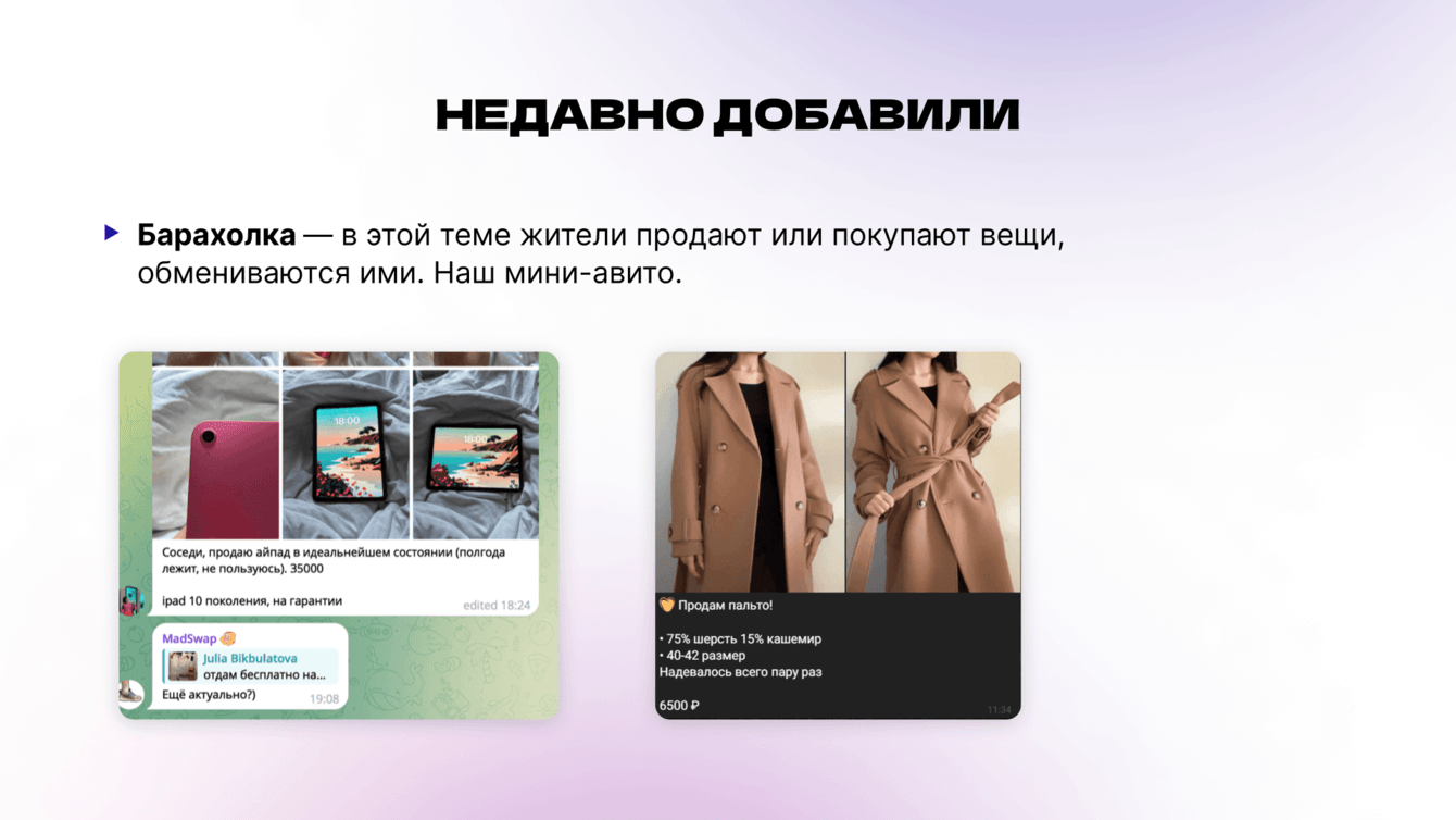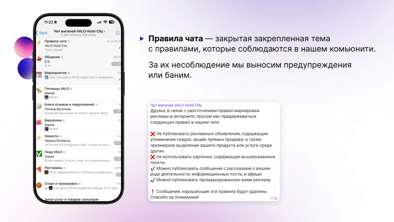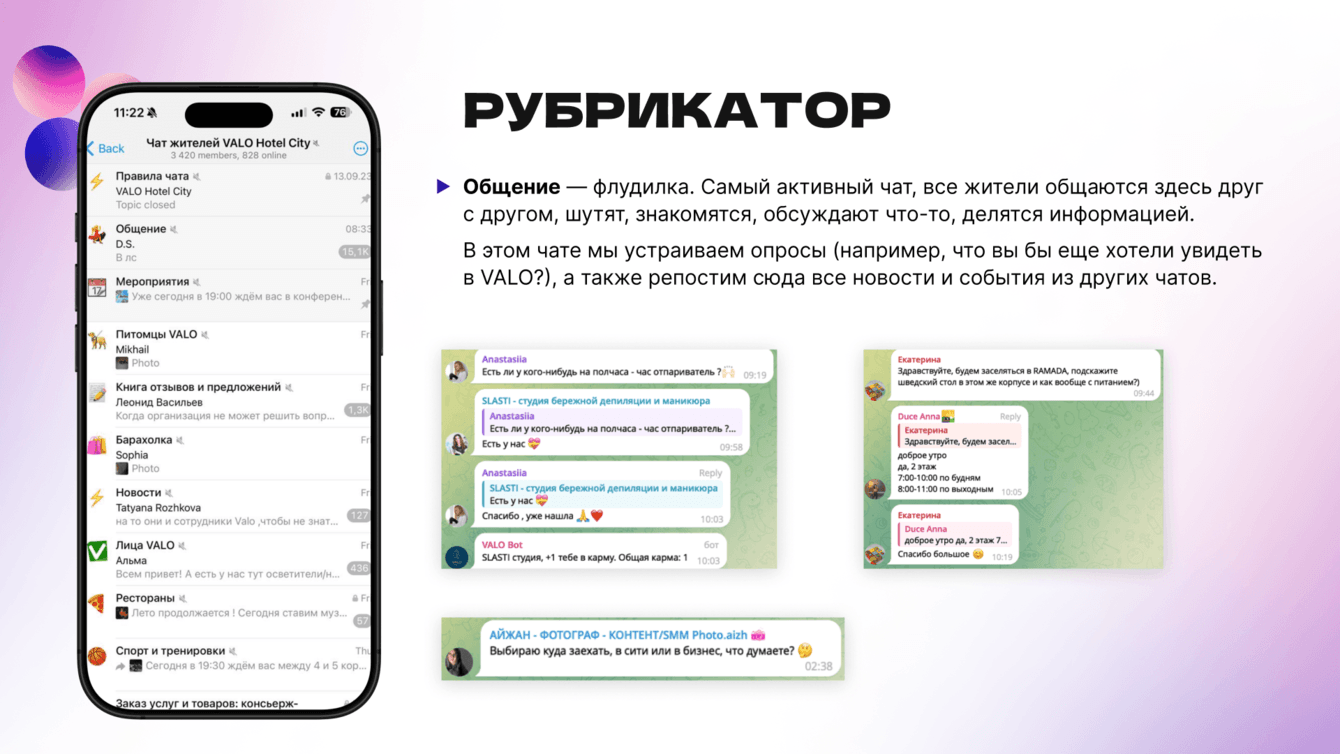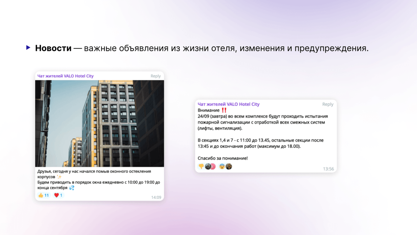 2. Оперативное информирование. Сообщество позволяет быстро доносить важные новости и обновления до всех участников. Например, любые изменения в правилах проживания, нововведения или анонсы мероприятий оперативно распространяются через телеграм-чат, что упрощает взаимодействие с жителями.