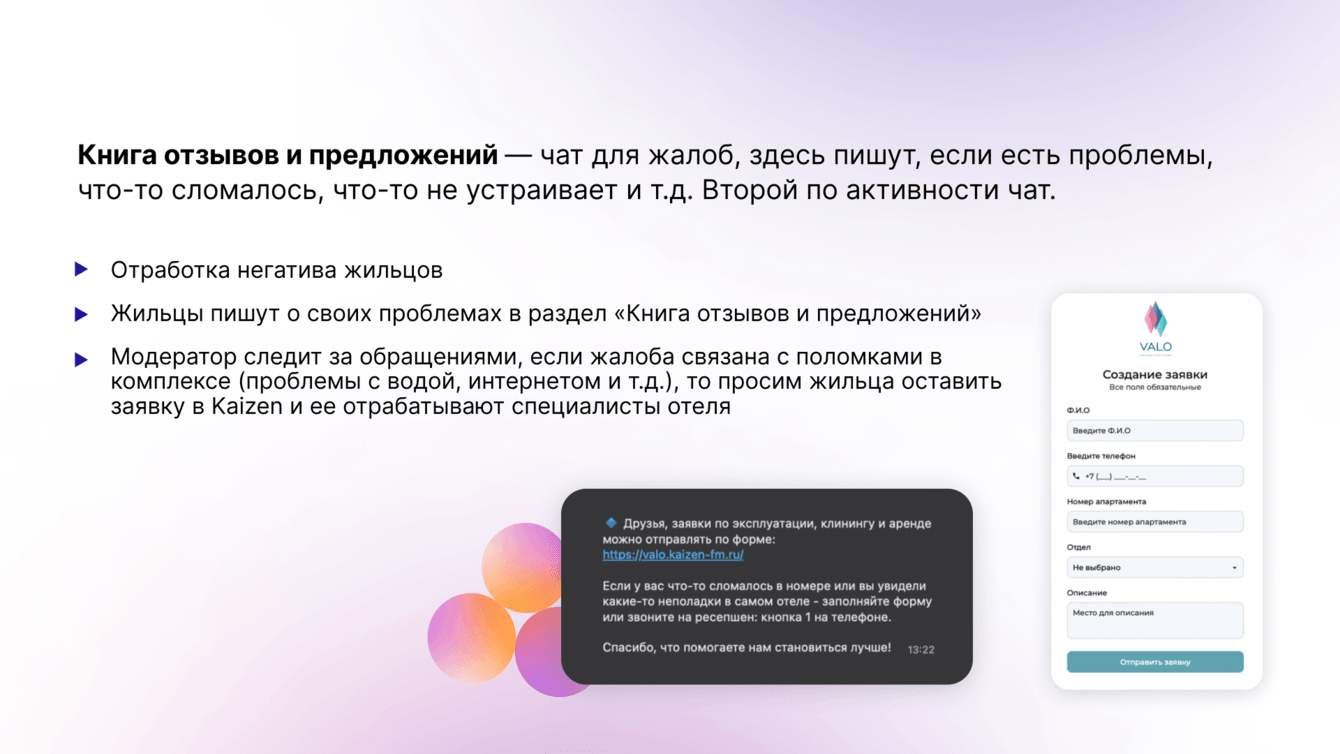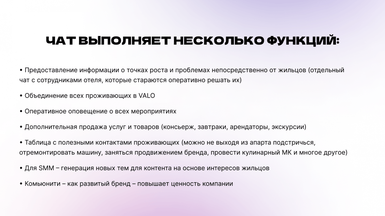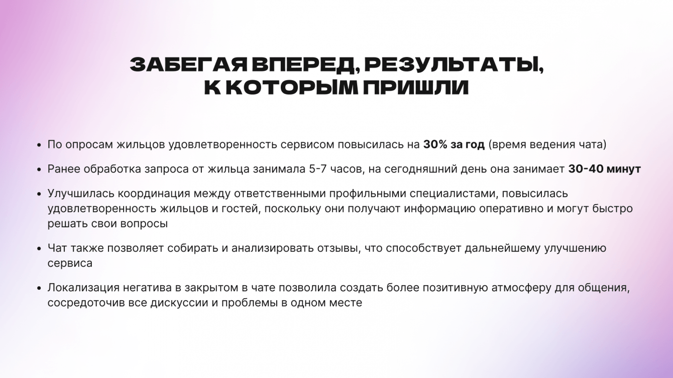 3. Решение проблем. Благодаря постоянной коммуникации с жителями, компания быстро узнает о проблемах, с которыми сталкиваются гости, и может оперативно их решать. Комьюнити становится местом, где клиент может напрямую задать вопрос или выразить недовольство, и получить ответ.