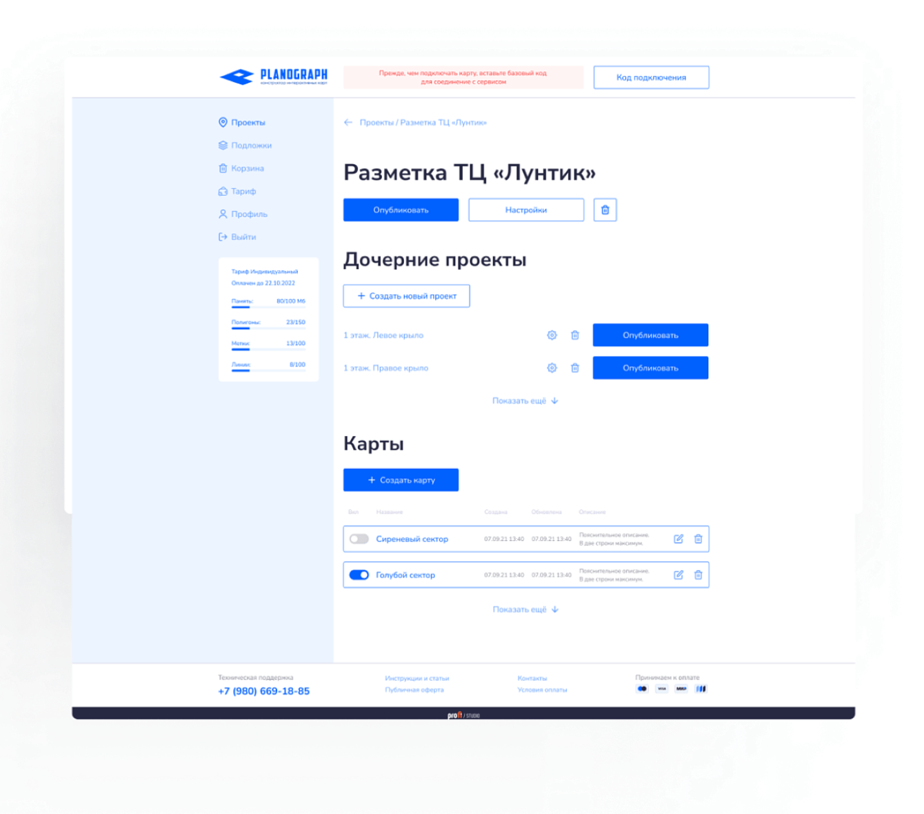 9) В проекте есть вложенные проекты — дочерние. Создав проект, пользователь может создать, редактировать, включить на сайте или удалить карту.