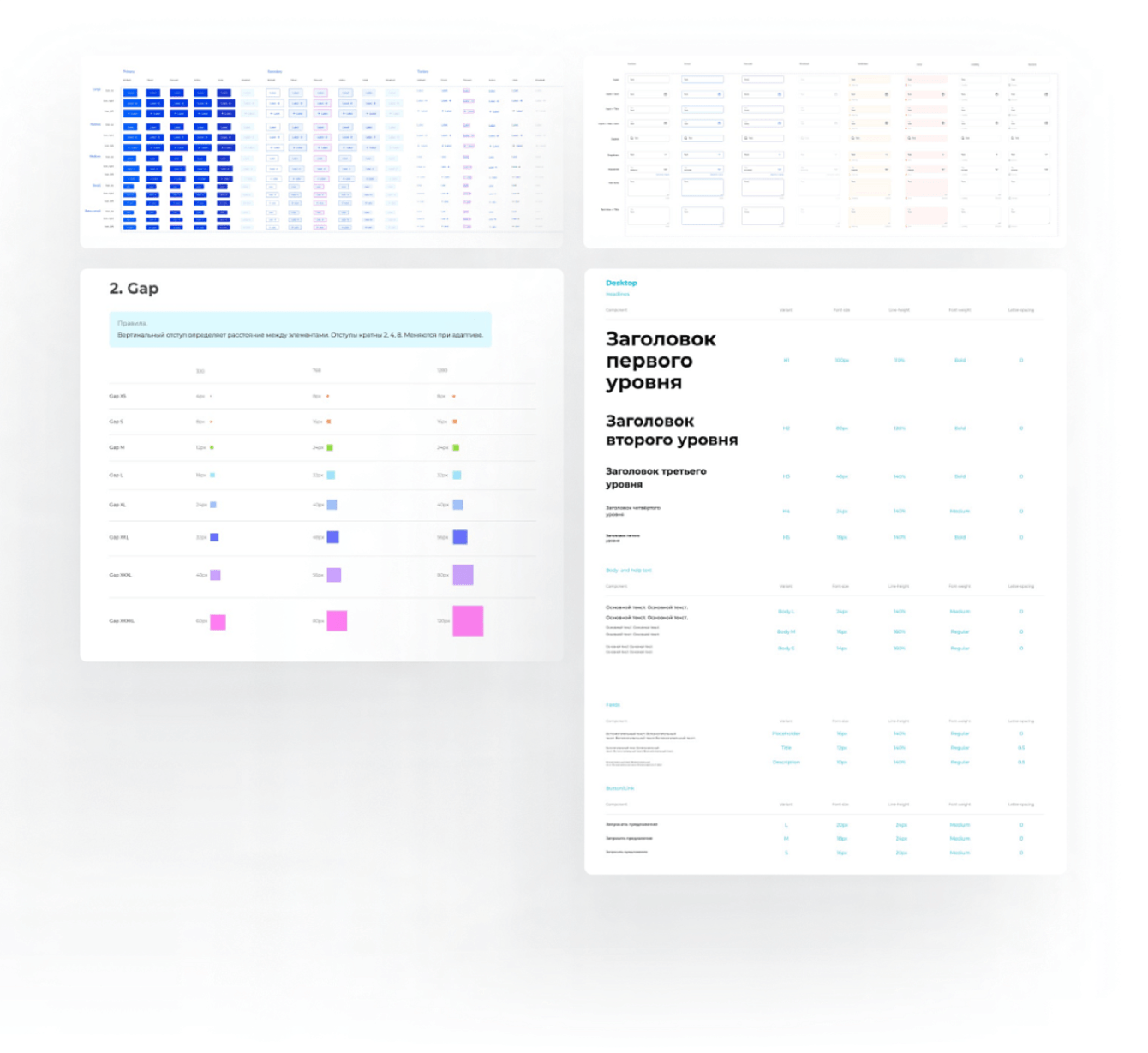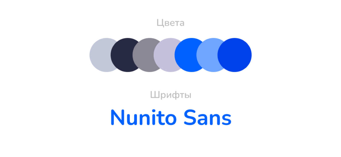 3) Разработана цветовая палитра на основе главного синего цвета. Кроме цветовых значений дизайн-система проекта включает: типографику, формы и UI-элементы, систему отступов.