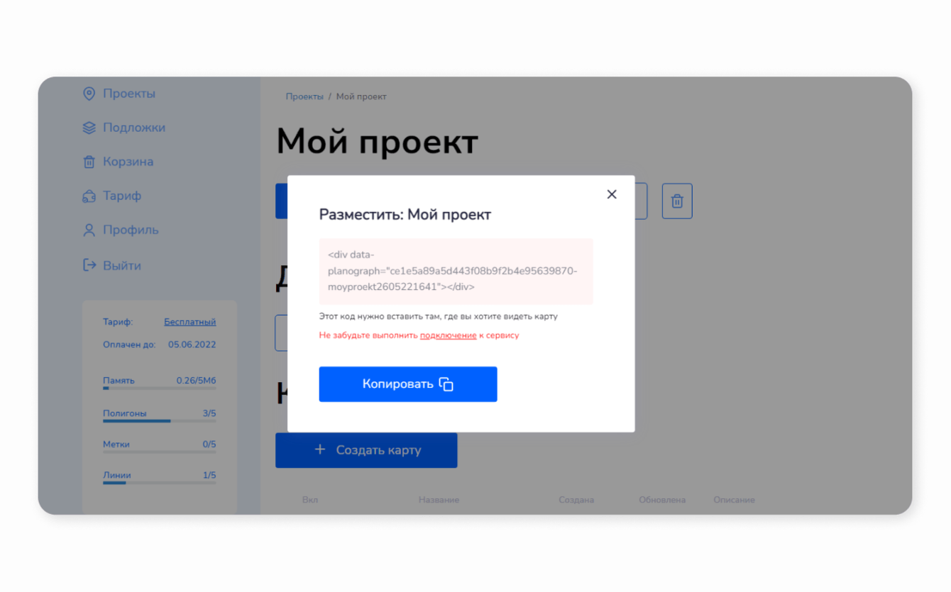 Доделав карту, пользователь получает код, который предназначен для вставки в веб-ресурс или приложение.