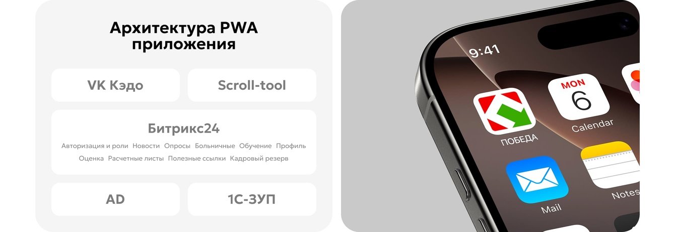 Кроме того, в связи с увеличением с 2022 года оттока кадров, требовались инструменты нематериальных бонусов для удержания и поощрения работников. Клиент сразу обозначил границы в виде бюджета, сроков, а также возможных затрат на поддержку и обслуживание мобильного приложения. Исходя из этих факторов нами была предложена технология PWA, backend которой стал — корпоративный портал ПОБЕДА на Битрикс24.