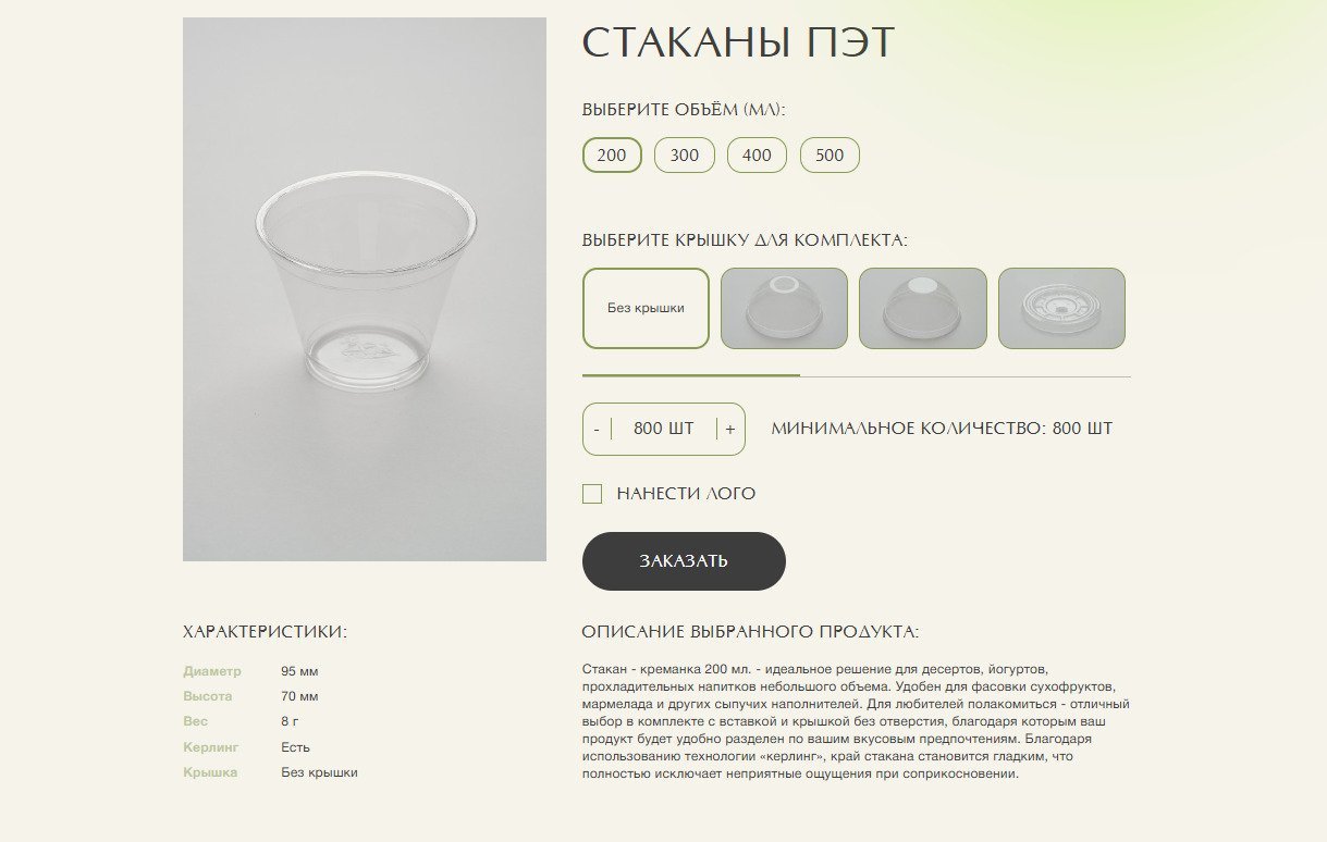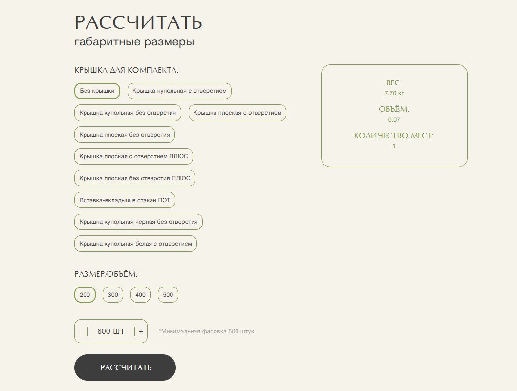 В карточке можно выбрать объем стакана и подходящую крышку, покупателю сразу подсвечивается минимальное количество для заказа.
