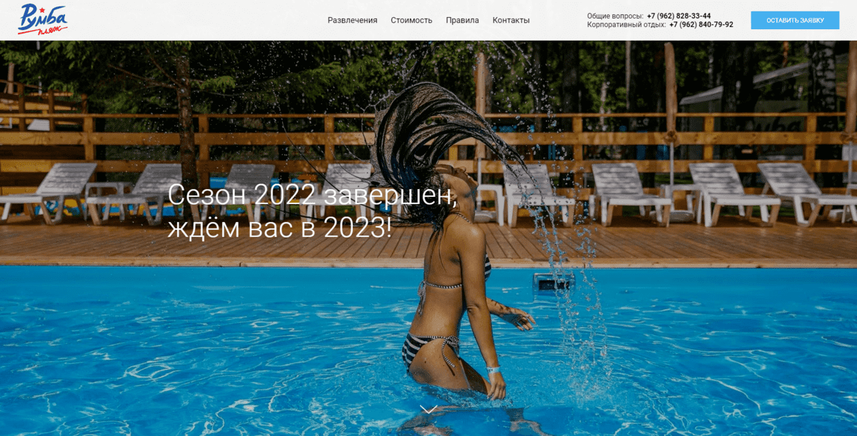 3. Выделили основные категории, которыми могут интересоваться посетители: стоимость, правила посещения, развлечения на территории бассейна – добавили для них кнопки в верхнем меню. Подготовили и разместили текстовые описания в этих разделах, а также контактную информацию о компании.