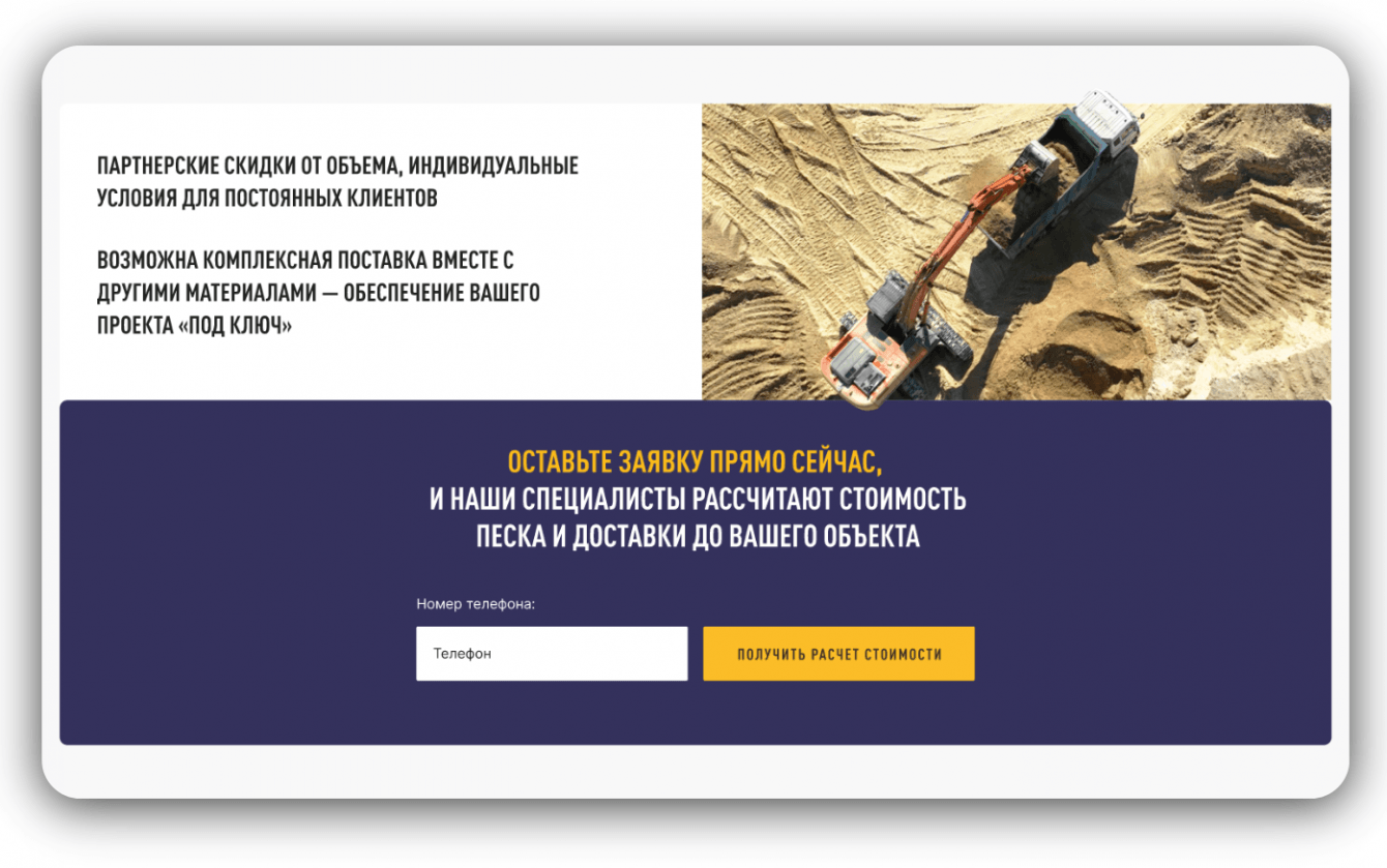 На первом экране акцентируется внимание на уникальных торговых предложениях, которые делают продукцию компании привлекательной для потенциальных клиентов. Заголовок «Речной песок по ГОСТу и ТР от производителя всего от 350 р/тонна» сразу подчеркивает конкурентоспособную цену и соответствие продукции государственным стандартам, что является важным фактором для юридических и физических лиц.