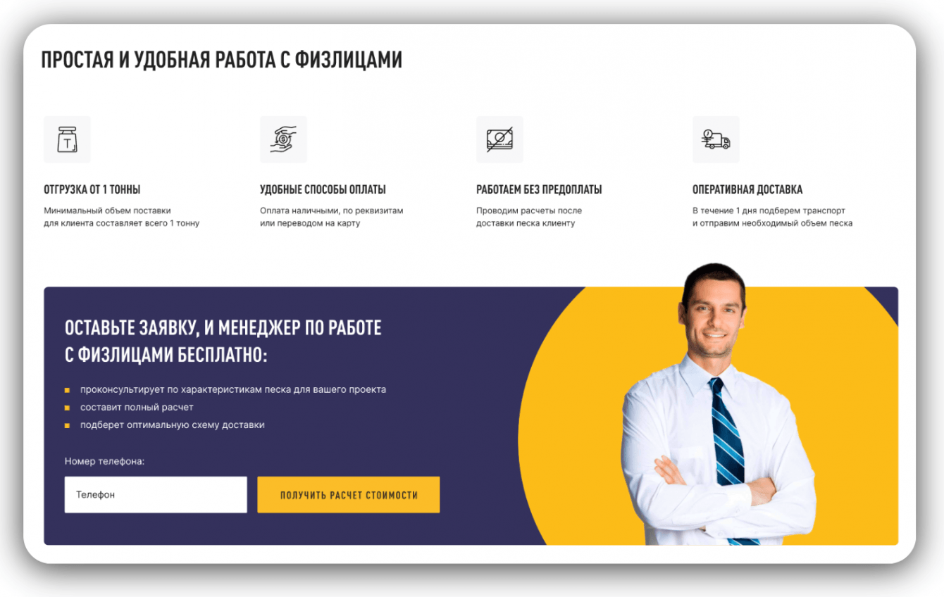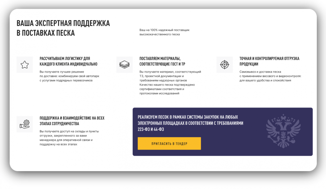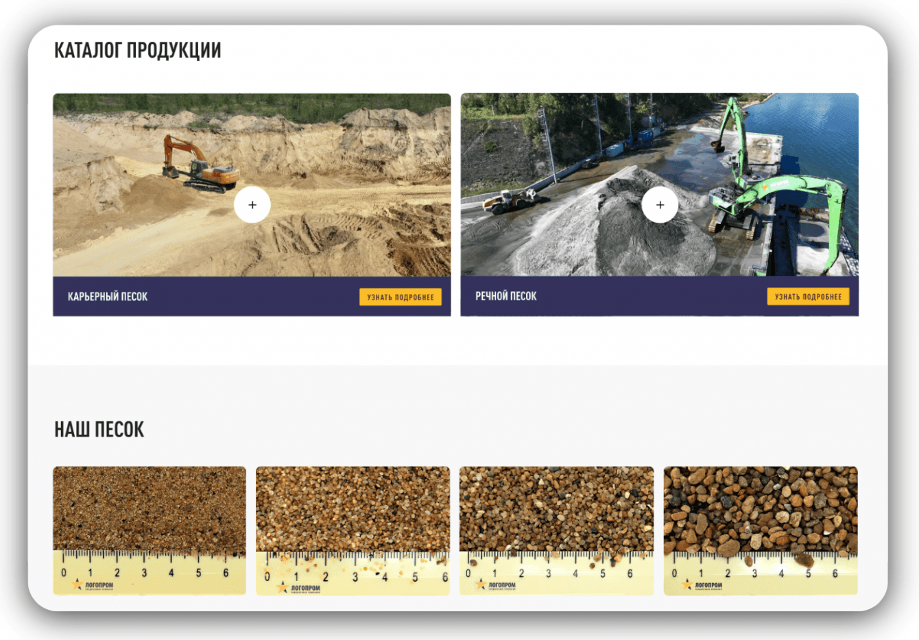В заключении рассказывается про этапы сотрудничества с юридическими и физическими лицами, размещаются фото и видео с мест добычи песка, карта пунктов отгрузки, ответы на частые вопросы.