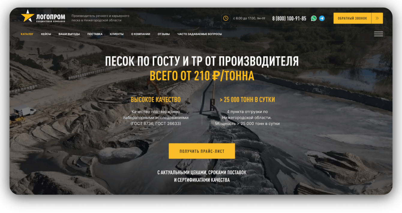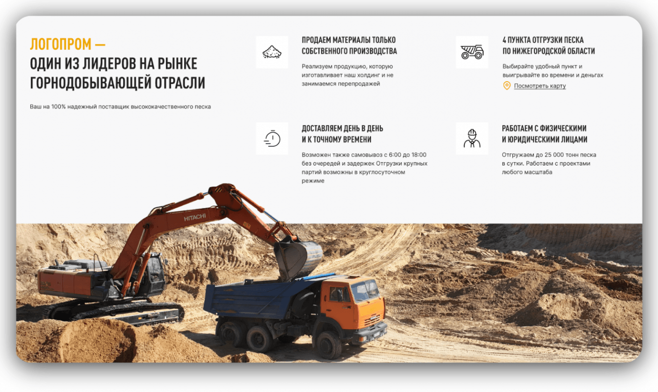 Новый лендинг направлен на услуги поставки речного и карьерного песка по Нижегородской области и ближайшим районам.
