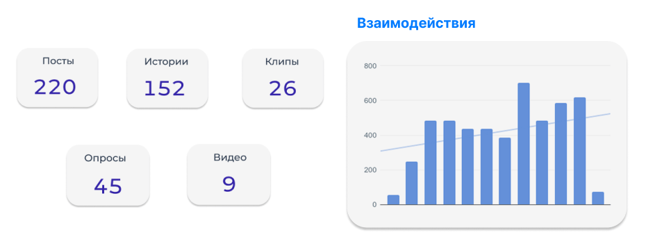 Использовали все возможные варианты публикаций: посты, клипы, истории.
