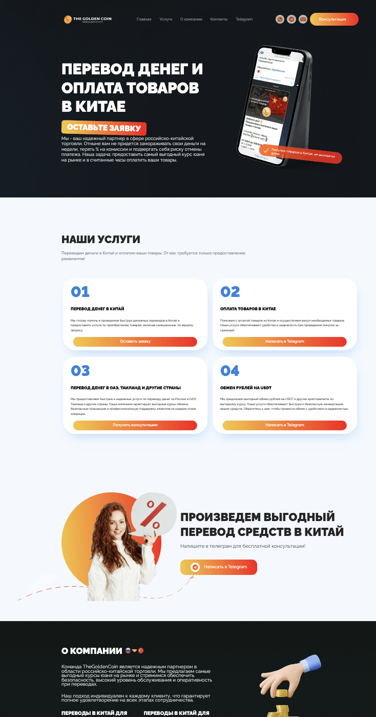 Для создания одностраничного сайта для клиента, владельца компании, предоставляющей услуги по переводу денежных средств в Китай, ОАЭ и другие страны, была проведена комплексная работа.