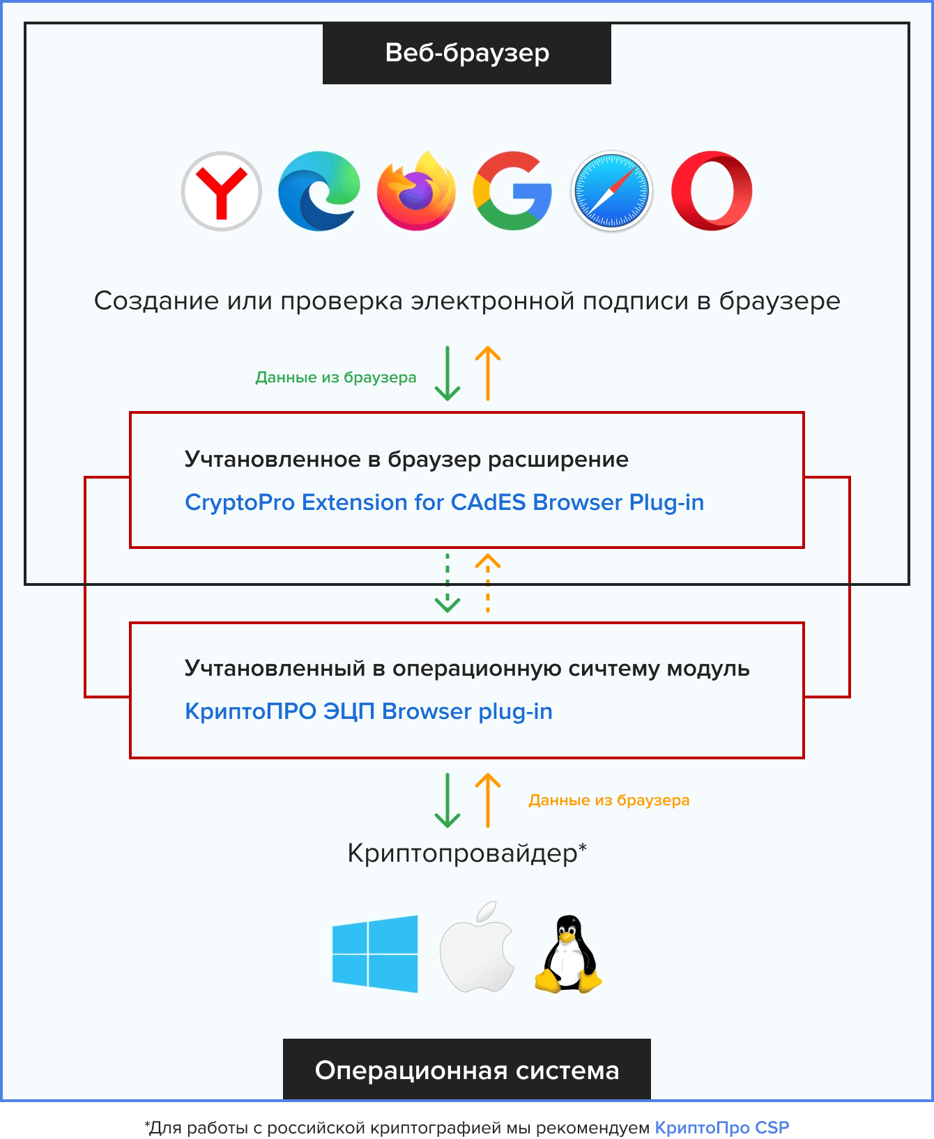 КриптоПро ЭЦП Browser plug-in используется нами для проверки электронной подписи и поддерживает работу с широким набором алгоритмов, как встроенных в операционную систему, так и доустановленных дополнительно.