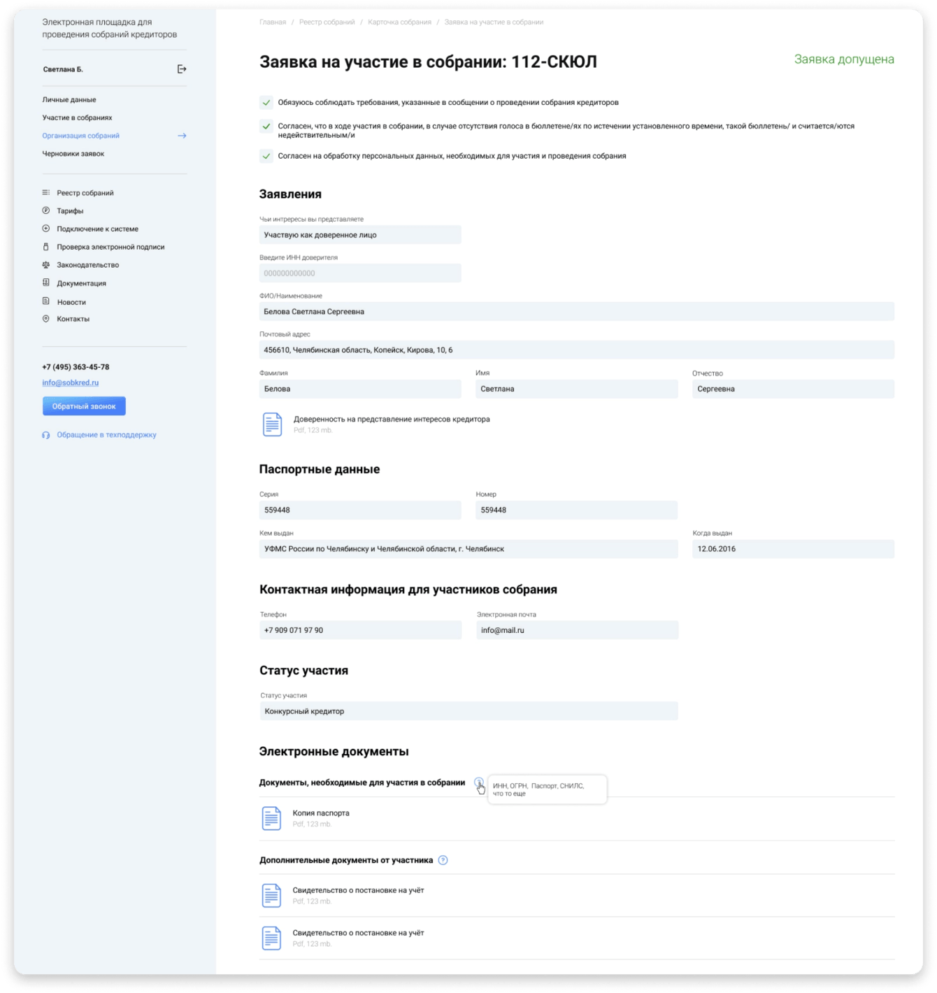 - собрание, на которое была подана заявка, отображается в личном кабинете участника в разделе «Участие в собраниях»;