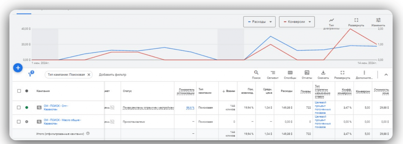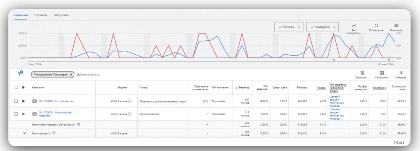 Рекламную кампанию по общим запросам после теста выключили, так как получался слишком высокий CPA. По оптовой кампании стоимость лидов на приемлемом уровне, конверсия сайта составляла 2,9%