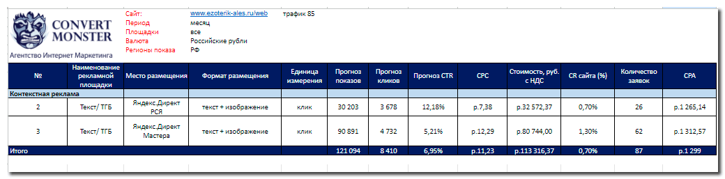 Подготовили медиаплан, согласно которому в месяц можно собрать 87 заявок по 1299 руб.