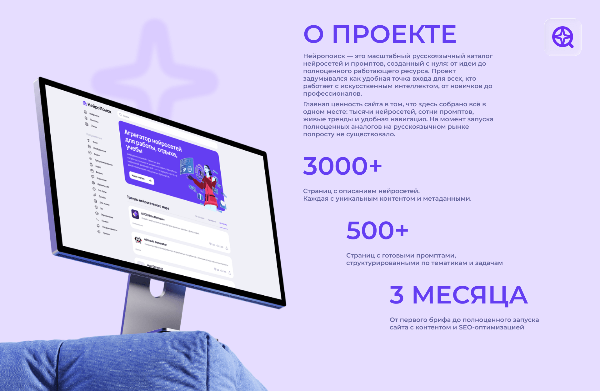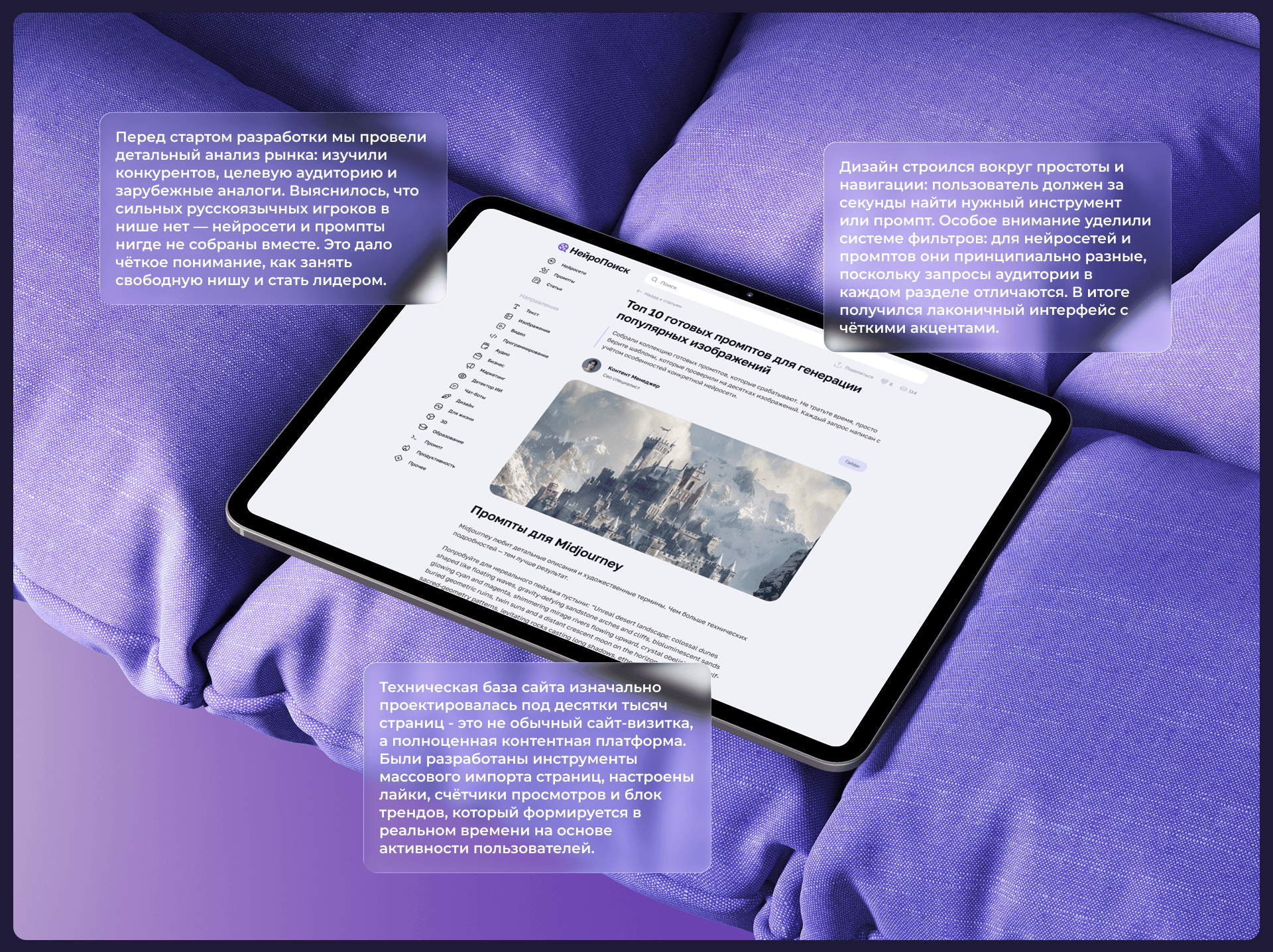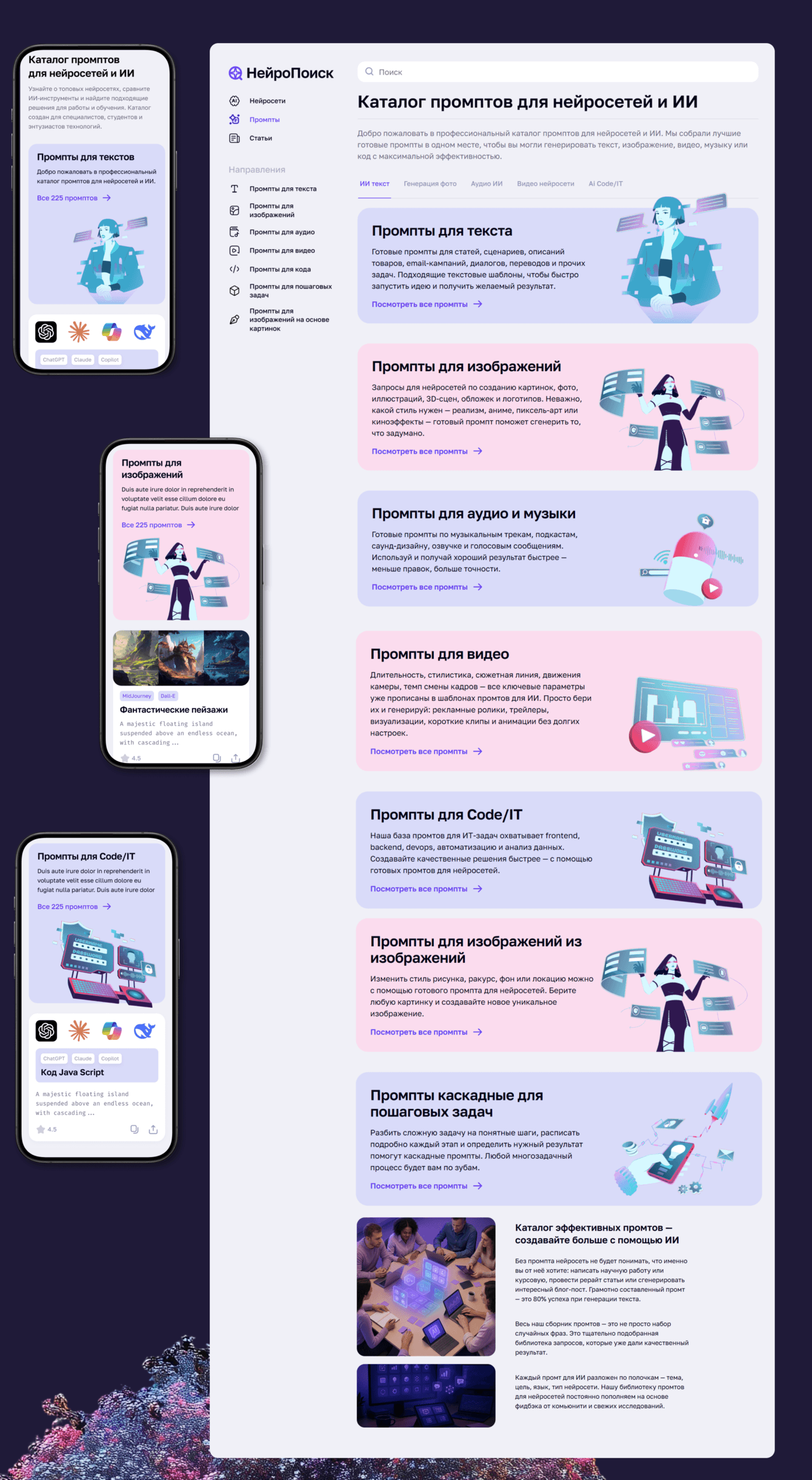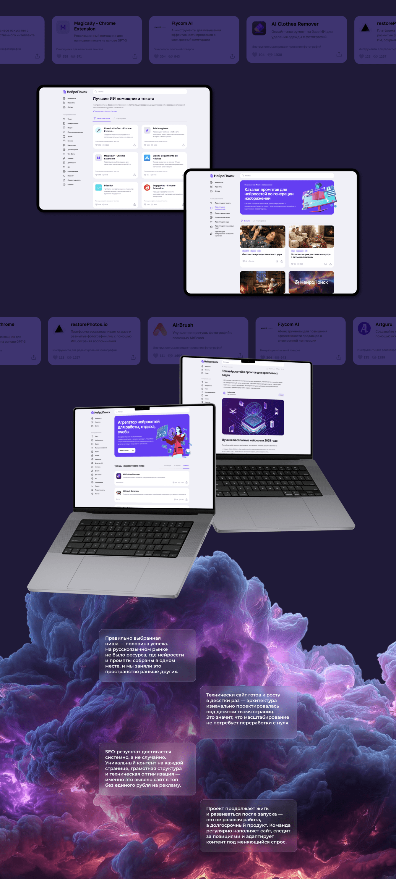 Заказчик обратился с идеей создать масштабный русскоязычный ресурс, где в одном месте были бы собраны нейросети и промпты — удобный, SEO-оптимизированный каталог, способный привлекать органический трафик и в перспективе монетизироваться.