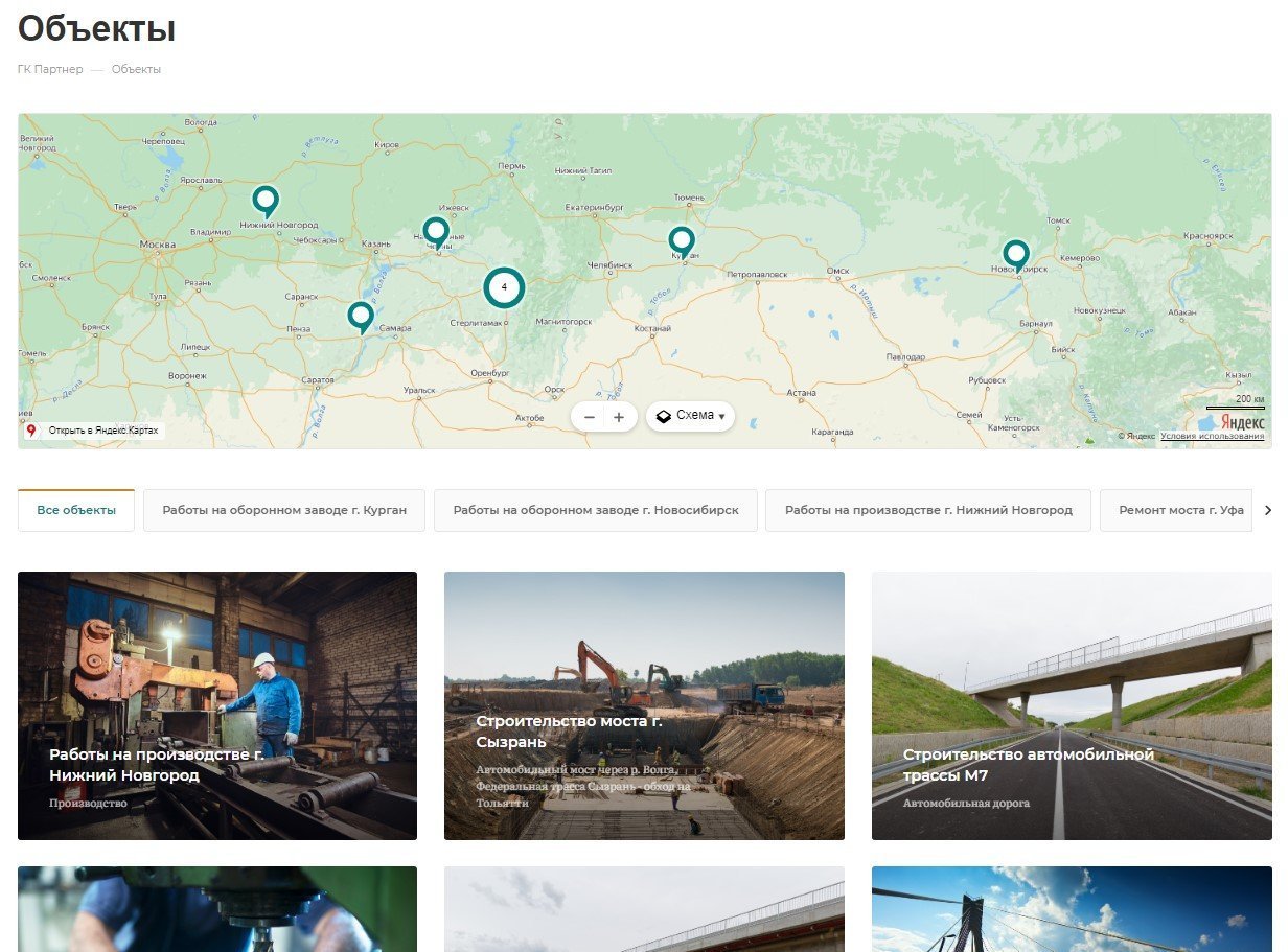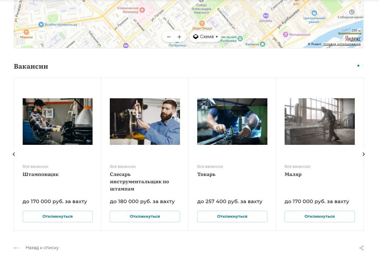 В разделе объекты расположены карточки предприятий партнеров, куда набираются работники. В самой карточке объекта находится информация о местонахождении, краткое описание работ и требующиеся вакансии.