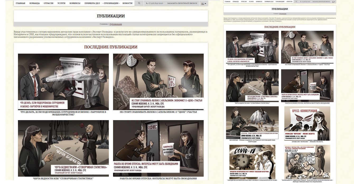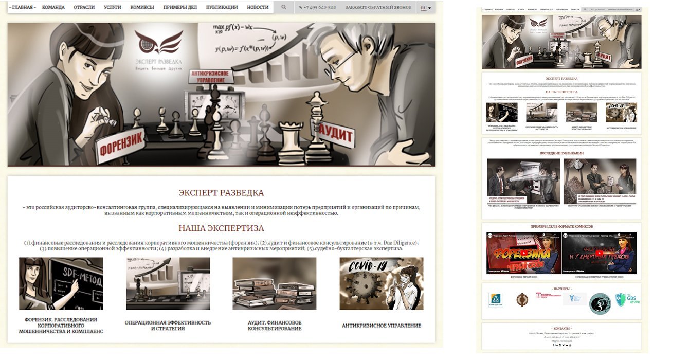Эксперт Разведка - это российская аудиторско-консалтинговая группа, специализирующаяся на выявлении и минимизации потерь предприятий и организаций по причинам, вызванным как корпоративным мошенничеством, так и операционной неэффективностью. Нашей задачей было создание запоминающегося и удобного бизнес-сайта.