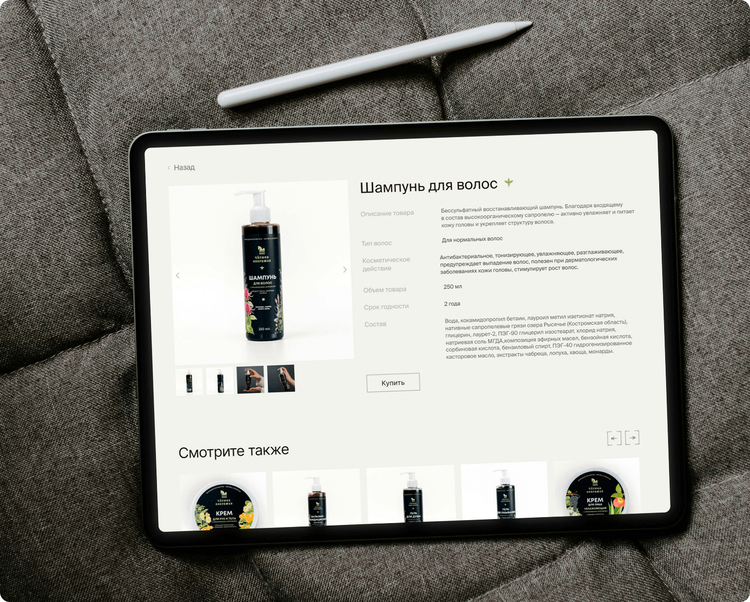 Каждый продукт имеет отдельную страницу, где представлена подробная информация о его составе, свойствах и преимуществах. Здесь можно узнать, для какого типа кожи или волос он подходит, какие натуральные компоненты входят в состав и как они воздействуют. Для удобства размещены фотографии продукта с разных ракурсов, а также изображения текстуры и упаковки.