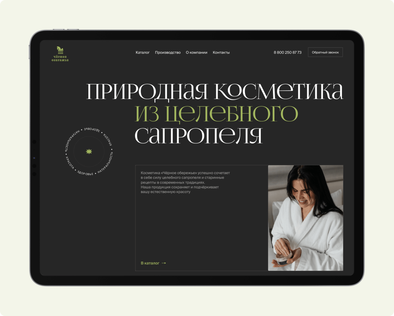 Этот проект стал логичным продолжением нашей работы с компанией и позволил создать современный, стильный и атмосферный сайт, отражающий суть и философию бренда, его заботу о природности продукции и высокие стандарты ручного изготовления косметики.