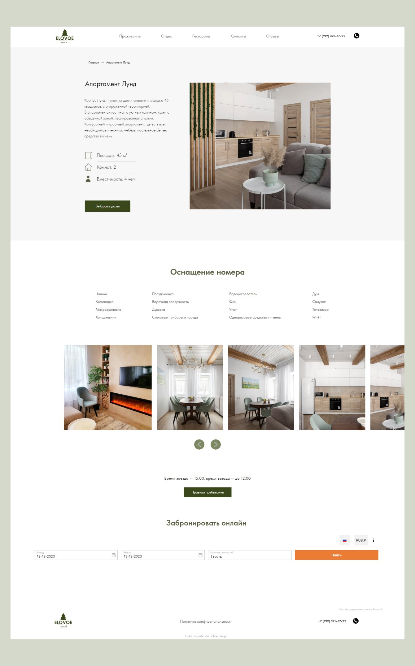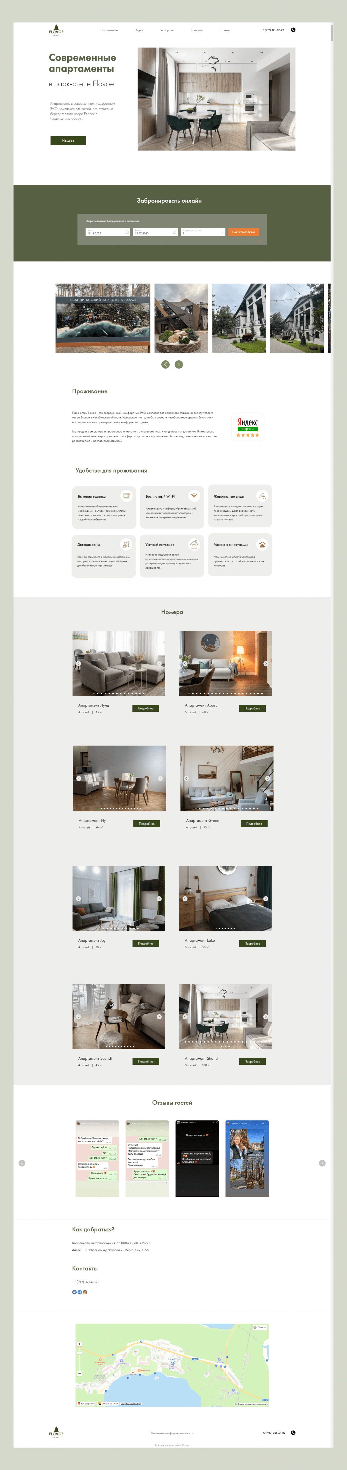 Дизайн сайта выполнен минималистично в соответствии стилистике апартаментов с использованием цвета #39471B с логотипа.
